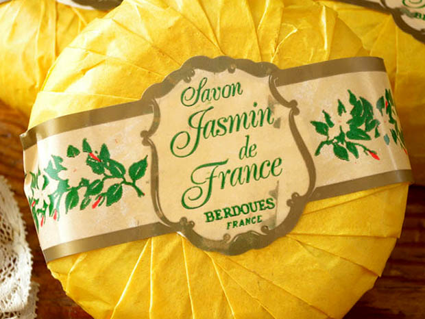 マルセイユから西へ150kmほど行ったトゥールーズのCugnaux(キュグノー)の町で1902年に創設されたBerdoues(ベルドゥー)社が、おそらく1960年代に製造した未使用のJasmin de France(ジャスマン・ドゥ・フランス)という商品名のサヴォンが3個入っているジャスマン・ドゥ・フランスサヴォン3&ボワットです。1850年代頃からトゥールーズの町ではヴィオレット(スミレ)の花の栽培が協同組合ができるほど盛んになりパリ、ロンドン、ウィーン、ブダペストそしてモスクワまで列車で配送したようです。ベルドゥー社はそのヴィオレットの花から香水を製造して1936年に発売したViolettes de Toulouseヴィオレット・ドゥ・トゥールーズ)という香水はヨーロッパでとても有名だったようです。こちらは超レアなトゥールーズのJasmin(ジャスマン/ジャスミン)のお花を使って製造した未使用のサヴォン(石鹸)が3個入った透明なおそらくビニール製の筒型のサヴォンボワット(ソープボックス)で、フタの内側には淡いロゼベージュにオール(ゴールド)の縁取りとジャスマンのお花のイラストがデザインされた丸い紙が入れられています。また、ヴェール(グリーン)色のリュバン(リボン)が付いた本体の内側にはロゼベージュにオールの飾り罫の中のヴェールの3 Savons Jasmin de France Berdoues Franceのロゴと文字とジャスマンのお花のイラストがデザインされた紙が入れられていてエレガントでオシャレでとてもいい感じです。また、背面にはPoids net a l'emballage(包時の正味重量) Net weight(正味重量) 300g - 10,5 oz 3 Savons A G 80% Made in France Ref. :95-23 P. B.s.a - P.o. Box 6 31270 Cugnauxの表示があります。また、オークルジョーヌ(イエローオーカー)の紙に包まれたサヴォンには、ロゼベージュにオールの縁取りの帯が巻かれていて、こちらにもSavons Jasmin de France Berdoues Franceのロゴと文字とジャスマンのお花のイラストがデザインされているのも素敵です。フタを開けるとエレガントで爽やかなジャスマンのお花の香りが漂いうっとりとしてしまいそうな大変美しい一品です。