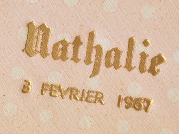 フランスにある菓子店が、1960年代に製造した未使用のボンボン(お菓子)が入っていた厚紙製のロゼ&イヴォワールポワ・ドラジェボワットです。Dragee(ドラジェ)はアマンド(アーモンド)やショコラ(チョコレート)などを糖衣で包んだボンボンのようで南フランスのプロヴァンス地方で多く製造されているようです。こちらは大変レアなおそらくべべ(ベビー)が誕生したお祝いの品として製造されたDragees Boite(ドラジェボワット/糖衣菓子ボックス)で、フタと本体はロゼパール(ペールピンク)地にイヴォワール(アイボリー)のポワ(水玉模様)がデザインされた化粧紙が貼られていますが、まるで太鼓(たいこ)や鼓(つづみ)のようなフォルムに作られていてオシャレで可愛くてとてもいい感じです。また、フタのフチには木綿のブランシュ(ホワイト)のドンテル(レース)飾りが付けられていますが、本体はロゼのリュバン(リボン)で結ばれているのも素敵です。また、本体の側面ははプリエ(ひだ)飾りのように化粧紙が貼られていてとても凝った作りです。また、フタには名前のNathalie(ナタリー)と3 Fevrier 1967の文字がオール(ゴールド)の高価な箔押してでデザインされていますが、おそらく1967年の2月3日に生まれたナタリーちゃんのお祝いの贈答品として作られたもののようです。今から56年前に可愛いべべの誕生のお祝いに作られた大変素敵なロゼパール&イヴォワールポワ・ドラジェボワットです。