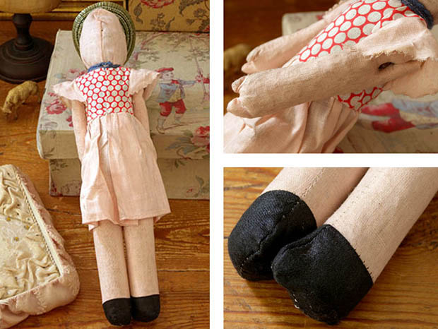 フランスのでおそらく1920年代にコンポジションと木綿の生地で製作されたボネ&ローブ・ジュンヌフィーユコンポジションプーペです。コンポジション(おがくずや粘土などをニカワなどで混ぜ合わせて型抜きしたもの)は、ドイツで1840年代頃から製作された頭が磁器で作られたビスキュイプーペ(ビスクドール)の胴体や腕や脚に使われていましたが、その後、製作が難しい磁器の頭に代わって全身がコンポジションで作られたプーペ(ドール)が多く製作されるようになったようです。こちらは超レアな高級なモヘアの美しいシュヴーブロン(ブロンドヘア)におそらくヴェールムース(モスグリーン)のセルロイドで表面が覆われた厚紙製のツバのあるとても凝った作りのロゼパール(ペールピンク)の木綿のボネ(ボンネット)をかぶってルージュ(レッド)地にブランシュ(ホワイト)の水玉模様の生地とロゼパールの生地で作られたローブ(ドレス)を着たジュンヌフィーユ(少女)のコポジションプーペで、彩色された美しいブルーの瞳とルージュ(レッド)の口元で優しく微笑んだような表情がオシャレで可愛くてとてもいい感じです。また、ブルーの襟ぐりも可愛いですね。また、頭はコンポジション製で胴体と腕と脚は肌色の生地で作られていて中にはおそらく硬い木毛と柔らかなカポック(パンヤノキの綿毛)を混ぜたのもが詰められているようです。また、胴体と腕と脚が針金でジョイントされているので動かすことができます。また、足にはノワール(ブラック)の生地で作られたショシュール(シューズ)を履いているのもオシャレです。優しそうな美しいブルーの瞳に見つめられているだけでどんどんとコンポジションプーペの世界へ引きずり込まれて行ってしまいそうな大変可愛いボネ&ローブ・ジュンヌフィーユコンポジションプーペです。