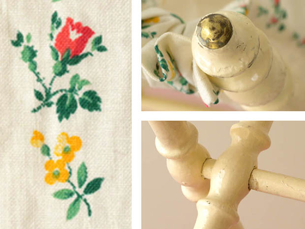 フランスでおそらく1930年代にティッシュ(生地)とボア(木)で製作されたローズ&シリドゥワヌティッシュ・ボアトラヴァイユーです。こちらは超レアな編み物用の毛糸や編み棒やプーベ(ドール)やぬいぐるみなどを入れるために作られた折りたたみができる硬くて良質なボアで作られてクレーム(クリーム)色に塗装されたTravailleuse(トラヴァイユー/働きものツール)で、美しいボアトルネー(ボビンターン)の装飾的な加工がしてある四本の脚を中央で交差させた本体の上部には、イヴォワール(アイボリー)地に可憐なルージュ(レッド)のコローズのお花とジョーヌ(イエロー)のシリドゥワヌ(クサノオウのようなお花模様がアンプリメ(プリント)されたティッシュが取り付けられていてオシャレで可愛くてとてもいい感じです。また、脚の上部の先端には4個の丸い真鍮部品が付けられていてとても凝った作りですが、折りたたむととても小さくなるので収納にも便利ですが、左右のティッシュの外側には持ち運びに便利なティッシュの持ち手が付けられていてとても作りがいいですね。また、フランスに限らずウロープ(ヨーロッパ)では家具は昔からある古い家具を大切に使い続けていますが、パリのアパルトマンは決して広いとはいえないので、パリジェンヌ達は新たに家具を買うというよりは昔からある古い家具をいろいろ工夫してオシャレに使っているようです。また、元から付けられていたティッシュは傷んでしまったのでおそらく1950年代頃にこちらのお花模様のティッシュに取り替えられたようです。テディウルス(テディベア)を入れて飾ったりクチュール(ソーイング)で使ったりと工夫次第で色々と楽しくオシャレに使えそうな大変素敵な一品です。