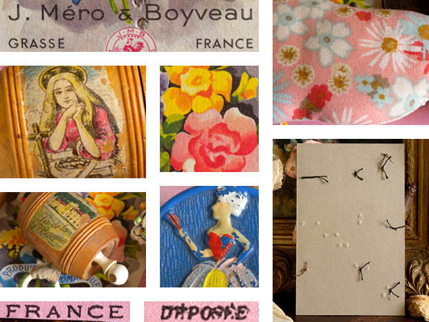 フランスで1910年代から1950年代頃のジュモーやシモン&ハルビッヒなどのビスキュイプーペ(ビスクドール)用の小物を使っておそらく1940年代の終わり頃に作られたほとんどデッドストックのフィーユティッシュプーペ・プーペアクセスソワー10アンサンブルです。こちらは超レアなロゼ(ピンク)の台紙に細いカウチュ(ゴム)紐と紐で留められたPoupee Accessoires(プーペアクセスソワー/ドールアクセサリー)の10個のアンサンブル(セット)で、台紙の上部にはノワール(ブラック)でアラベスク模様の飾り罫とHaute Nouveaute Paris(パリの優れた新商品)の文字がデザインされています。また、台紙には左上から豪華なお花とアラベスク模様の飾り罫がデザインされた真鍮に金メッキされたBroche(ブローチ/ブロッシュ)がありますが、裏側は服に穴を開けないで簡単に取り付けられてとても凝った作りです。また、その下には美しい輝きのおそらく白蝶貝と真鍮で作られたCroix(クロワ/十字架)がとても素敵です。また、その右横にはお花とアラベスク模様がエンボスでデザインされたフタがヒンジで開け閉めできる丸いフォルムの真鍮に銀メッキされたPorte Photo Pendentif(ポルト・フォト・パンダンティフ/フォトペンダント)がありますが、本体にはアラベスク模様がエンボスでデザインされていて大変凝った作りです。また、フタを開けると中にはフィーユ(少女)とギャルソン(少年)のクロモが入れられていてとてもオシャレです。また、写真やクロモなどを固定する中枠もあり大変凝った作りです。また、その右横にはロゼ(ピンク)やヴェール(グリーン)のペルル(ビーズ)の髪飾りを付けて首にもロゼのヴェールのペルルのコリエ(ネックレス)をしてブランシュ(ホワイト)のローブ(ワンピース)を着たフィーユのTissu Poupee(ティッシュプーペ/クロスドール)がありますが、ローブとショシュール(シューズ)にもペルルが付けられていてとても可愛いですね。また、背面はロゼ地に白いマルグリート(マーガレット)などのお花模様の生地で作られているのもオシャレです。また、その右横にはおそらく磁器製のヴェールパールにロゼのお花がデザインされた大変凝った作りのChapeau Epingle(シャポーエパングルハットピン)がありとてもオシャレです。また、左端には木製のEtui Aiguille (エチュイ・エギュイーユ/針ケース)が付いたBobine(ボビヌ/糸巻き)がありますが、本体にはアラベスク模様などが彫られていて大変凝った作りです。また、その下には扇子を持ってオシャレなローブ(ドレス)を着たマドモアゼルのルリエフ(レリーフ)がデザインされたブルーフォンセ(ダークブルー)のプラスチック製のBouton(ブトン/ボタン)があります。また、その右横にはSir de la Sainte Baume(サー・ドゥ・ラ・サント・ボーム)と書かれた南フランスのニースから南西へ30kmほど行ったラ・サント・ボームの町で土産物として売られていたセルロイドの持ち手の付いた木製の葡萄酒の樽がありますが、本体にはラ・サント・ボームの町とヴィエルジュ・マリア(聖母マリア)様のようなイラストがデザインされています。また、ロゼやジョーヌ(イエロー)のローズなどのきれいなお花とProduits Aromatiques(芳香剤) J. Mero & Boyveau(J. メロ & ボイヴォー) Grasse(グラース) France(フランス)と書かれた香水で有名なグラース社のChromos(クロモ)、ジョーヌとルージュ(レット)とノワール(ブラック)の色合いの美しいパピヨン(蝶々)のクロモが貼られていますがどれもデザインクオリティーが高くてエレガントでオシャレで可愛くてとてもいい感じです。また、台紙の下部にはFrance(フランス)Deposee(登録商標)の表示があります。こちらはおそらくパリにあるビスキュイプーペ(ビスクドール)を販売しているお店が、ビスキュイプーペの小物を見繕って制作して販売していたもののようですが、フランスのジュモーなどのビスキュイプーペは大変作りが良くて高額なので、そのビスキュイプーペが持つアクセスソワーも本物のように大変凝った作りのものが多いのですね。お気に入りのビスキュイプーペと飾りたい超レアな大変素晴らしい一品です。