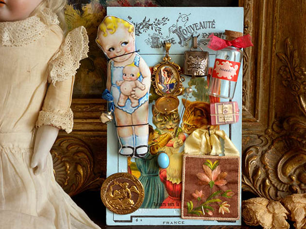 フランスで1910年代から1950年代頃のジュモーやシモン&ハルビッヒなどのビスキュイプーペ(ビスクドール)用の小物を使っておそらく1950年代に作られたほとんどデッドストックのキューピーティッシュプーペ・プーペアクセスソワー10アンサンブルです。こちらは超レアなブルーパール(ペールブルー)の台紙に細いカウチュ(ゴム)紐と紐で留められたPoupee Accessoires(プーペアクセスソワー/ドールアクセサリー)の10個のアンサンブル(セット)で、台紙の左上からブルークレール(水色)のサロペットを着たキューピーのTissu Poupee(ティッシュプーペ/クロスドール)がありますが、左手にはキューピーのプーペ(ドール)を持っているのも可愛いですが、右手にはブルーのリュバン(リボン)が付いた真鍮に銀メッキされた鈴を持っていてといも凝った作りです。また、背面はブルーヴェールフォンセ(ダークブルーグリーン)地に白いお花模様の生地で作られているのもオシャレです。また、その右横には真鍮に金メッキされたフタがヒンジで開け閉めできる楕円形のフォルムのPorte Photo Pendentif(ポルト・フォト・パンダンティフ/フォトペンダント)がありますが、本体の周りには豪華なアラベスク模様がルリエフ(レリーフ)でデザインされていてとても素敵です。また、フタにはマルグリート(マーガレット)のお花がルリエフ(レリーフ)でデザインされていてとてもオシャレですが、フタを開けると中にはお姫様のクロモが入れられていてとてもオシャレです。また、写真やクロモなどを固定する中枠もあり大変凝った作りです。また、その右横には振るとカラカラと鳴るメタル製の四角いフォルムのCloche(クロッシュ/ベル)がありますが、本体の正面にはお花のような模様がルリエフでデザインされています。また、背面にはChatel(シャテル)の文字のエンボスがあります。また、その右横にはルージュのリュバン(リボン)が結ばれてMusc(ムスク/ジャコウ)と書かれたエティケット(ラベル)が貼られたリエージュ(コルク)の栓が付いたガラス製の香料を入れるFlacon(フラコン/ピンボトル)があります。また、その下にはRose(ローズ) Honore Payan(オノレ・パヨン) France(フランス)と書かれたエティケット(ラベル)が貼られたオシャレなロゼ(ピンク)のサヴォン(石鹸)がありとても素敵です。また、その左横には美しい輝きのナクレ(シェルパール)のように作られたChapeau Epingle(シャポーエパングル/ハットピン)があります。また、左端には魚の背中に乗って魚の口に付けた手綱を操って海を渡っているアンジュ(天使)がルリエフでデザインされた真鍮に金メッキされた大きなBouton(ブトン/ボタン)がありとても凝った作りですです。また、その右横には美しいテュルコワーズ(ターコイズ)のような石が付けられた真鍮に金メッキされたおそらくBoucle(ブークレ/バックル)があります。また、その右横には淡いジョーヌ(イエロー)のリュバンが付いた四角いおそらくソワ(シルク)地の布地にきれいなロゼなどのお花の刺繍がされたおそらく信仰者用の信具のScapulae(スカプラリオ)があります。また、おそらく1910年代のRetours vers la mere(母親の所に戻る)と書かれたLes Trois Petits Chats(三匹の子猫)のお話の大変可愛いChromo(クロモ)が貼られていてどれもデザインクオリティーが高くてエレガントでオシャレで可愛くてとてもいい感じです。また、台紙の下部にはFrance(フランス)とDeposee(登録商標)の表示があります。こちらはおそらくパリにあるビスキュイプーペ(ビスクドール)を販売しているお店が、ビスキュイプーペの小物を見繕って制作して販売していたもののようですが、フランスのジュモーやなどのビスキュイプーペは大変作りが良くて高額なので、そのビスキュイプーペが持つアクセスソワーも本物のように大変凝った作りのものが多いのですね。お気に入りのビスキュイプーペと飾りたい超レアな大変素晴らしい一品です。