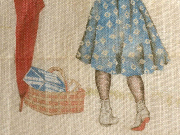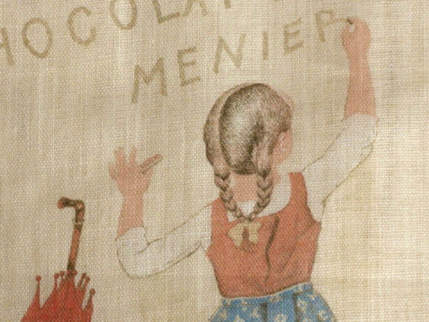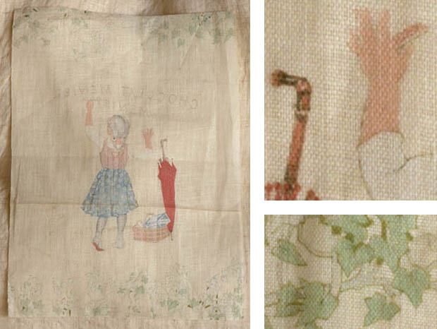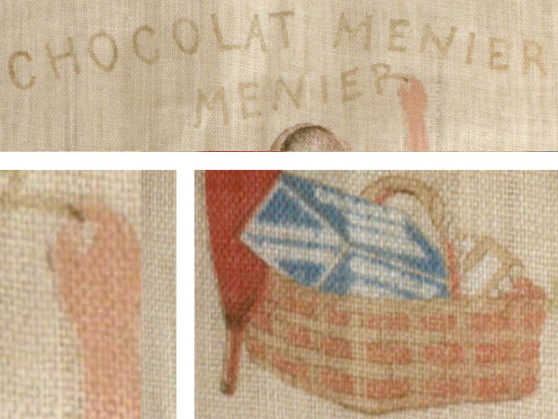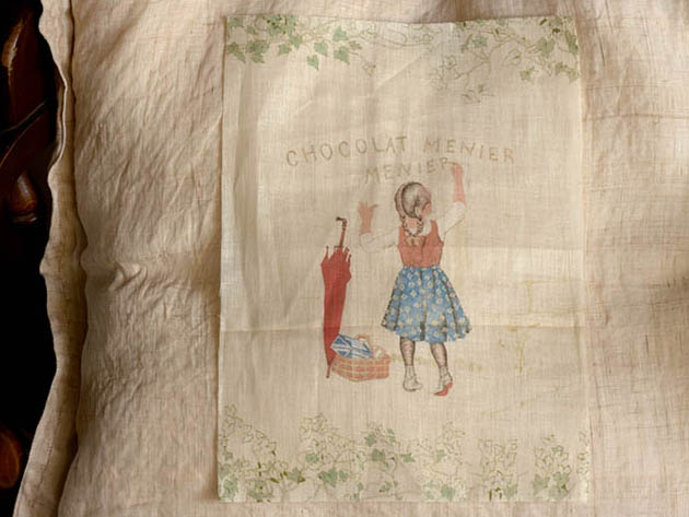 パリで1816年にアントワーヌ・ブルタース・ムニエが創設したChocolat Menier(ショコラムニエ)社が、おそらく1900年代に広告宣伝用に制作したラン(リネン)製のショコラムニエ・フィーユセルヴィエットです。ムニエ氏は薬剤師で創業当時は苦い散薬の錠剤の表面を覆うためにショコラ(チョコレート)を使用していましたがショコラの味が美味しいと評判になり、その後ショコラの製造で成功していったようです。こちらは超レアなショコラムニエ社が広告宣伝用に作ったイヴォワールブランシュ(アイボリーホワイト)のServiette(セルヴィエット/ナプキン)で、エクリュ(生成り)の本体の表面にはリエール(ツタ)の這う白い壁にルージュとブルーフォンセのローブ(ドレス)を着て左手にショコラムニエ社のショコラを持ったフィーユ(少女)がブラン(ブラウン)のクレ(チョーク)でChocolat MenierとMenier(ムニエ)と書いているイラストがデザインされていてオシャレで可愛くてとてもいい感じです。また、フィーユの足元にはルージュの傘とパニエ(バスケット)に入ったショコラムニエ社のブルーフォンセのショコラボワット(チョコレートの箱)があるのも可愛いですね。また、こちらのイラストを描いたのは1859年にフランス南西部のタルヌ・エ・ガロンヌ県のMoissac(モワサック)の町で生まれた画家のFirmin Bouisset(フィルマン・ブイセ)のようですが、ブイセは子供を題材にした絵画を専門に描いているようです。また、彼は1892年にショコラムニエ社と契約して広告ポスターのイラストを描いたようです。また、こちらのフィーユは彼は娘のイヴォンヌをモデルにしたようです。1900年代に制作されたショコラムニエ社の大変貴重な一品です。