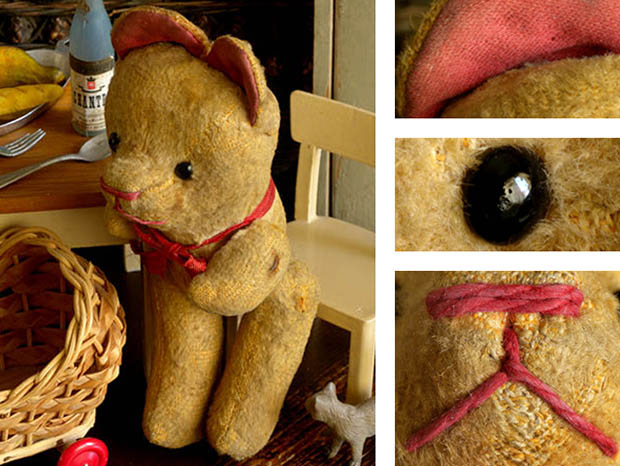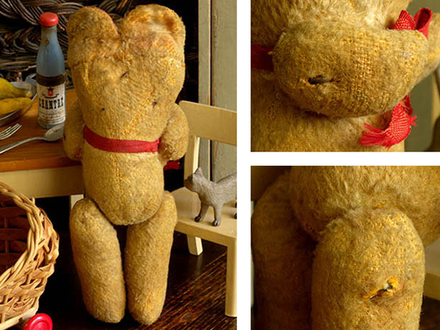 パリ郊外のEssonne(エソンヌ県)のMassy(マッシー)の町にあるJ. P. M.(Jouet Paris Massy/ジ・ペ・エム)社が、おそらく1940年代の終わり頃に製造したぬいぐるみのオールレーヌ&ルージュブランティッシュ・べべテディウルスです。J. P. M.(ジ・ペ・エム)はフランス語でJouet Paris Massy(ジュエ・パリ・マッシー)のことのようで「パリのマッシーのおもちゃ」という意味のようです。また、ジ・ペ・エム社の工場はやはりパリ郊外のSeine(セーヌ県)とOise(オアーズ県)にもあったようです。Teddy Ours(テディウルス/テディベア)は、1902年にアメリカのルーズベルト大統領が熊狩りで傷を負ったウルス(ベア)を逃がしてやったことが評判になったことで、ニューヨークの玩具店がドイツから輸入したウルスのぬいぐるみにルーズベルト大統領の愛称のTeddy(テディ)の名前を付けて売り出したのがテディウルスの始まりのようですが、世界で最初にウルスのぬいぐるみを製作したのはドイツのシュタイフ社のようです。こちらは超レアなオリジンヌ(オリジナル)のルージュフォンセ(ダークレッド)のリュバン(リボン)を首に結んだオール(ゴールド)のレーヌ(ウール)で作られたまだべべ(ベビー)のテディウルス、つぶらなノワール(ブラック)のガラスの目とルージュブラン(レッドブラウン)の糸で刺繍されたお鼻の下のお口で優しく微笑んでいるような表情がオシャレで可愛くてとてもいい感じです。また、耳の内側もルージュブランのティッシュ(生地)で作られているのも素敵ですね。また、前脚と後脚が太い針金でジョイントされているのでいろんなポーズが付けれますが、体の中は全て硬いザクザクとした木毛が詰められているようです。また、布タグはありませんが、おそらく首にはMarque Deposee(登録商標) Le Jouet Paris Massy(ラ・ジュエ・パリ・マッシー) Seto, J. P. M.と書かれた厚紙製のクール(ハート)形のタグが付けられていたようです。また、ジ・ペ・エム社のテディウルスの特徴は耳の外側と内側が対照的な色合いのようですが、オールとルージュブランの色合いですがフランスらしくて大変オシャレですね。また、ジ・ペ・エム社のテディウルスは、フランスでも大変人気が高いので入手が大変難しくなってきているようです。フランスから遥々やって来た可愛いべべのテディウルスが傍にいるだけで気持ちが優しく癒されてしまいそうな超レアな大変素敵な一品です。