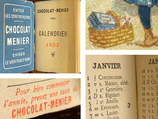 パリで1816年にアントワーヌ・ブルタース・ムニエが創設したChocolat Menier(ショコラムニエ)社が、1902年に広告宣伝用に制作した厚紙と紙製のショコラムニエ・カランドリエミニアチュールリーブルです。ムニエ氏は薬剤師で創業当時は苦い散薬の錠剤の表面を覆うためにショコラ(チョコレート)を使用していましたがショコラの味が美味しいと評判になり、その後ショコラの製造で成功していったようです。こちらは超激レアなショコラムニエ社が広告宣伝用に作った1903年のカランドリエ(カレンダー)がデザインされたブルーフォンセ(ダークブルー)のMiniature Livre(ミニアチュールリーブル/ミニチュアブック)で、本体は表紙を入れて全部で52ページあります。また、表紙にはChocolat Menierのロゴとショコラのお店の壁にルージュフォンセ(エンジ)とブルーフォンセ(ダークブルー)のローブ(ドレス)を着て左手にショコラムニエ社のショコラを持ったフィーユ(少女)がオール(ゴールド)のクレ(チョーク)のようなものでChocolat Menier 1903と書いているイラストがデザインされていてオシャレで可愛くてとてもいい感じです。また、フィーユの足元にはパニエ(バスケット)に入ったショコラムニエ社のショコラボワット(チョコレートの箱)があるのも可愛いですね。また、裏表紙にはMedailles Diplomes d' Honneur(メダルと名誉賞状)の文字と1849年から1880年迄に様々な博覧会で受賞したメダイユ(メダル)のイラストがデザインされているのも素敵です。また、イラストは高価な全て特色を使った石版印刷で刷られているので何年経っても発色がよくて素晴らしいですね。また、こちらのイラストを描いたのは1859年にフランス南西部のタルヌ・エ・ガロンヌ県のMoissac(モワサック)の町で生まれた画家のFirmin Bouisset(フィルマン・ブイセ)のようですが、ブイセは子供を題材にした絵画を専門に描いているようです。また、彼は1892年にショコラムニエ社と契約して広告ポスターのイラストを描いたようです。また、こちらのフィーユは彼の娘のイヴォンヌをモデルにしたようです。また、表紙の裏にはEviter les Contrefacons(偽造品にご注意下さい) Chocolat Menier, Exiger le veritable nom(正しい名称の商品をお買い求め下さい)の表示があり最初のページにはChocolat Menier Calendrier(カランドリエ/カレンダー) 1903と書かれています。また、次のページからは1903年の1月1日の木曜日から12月31日の木曜日 までのカランドリエがデザインされています。また、1月のカランドリエには「新年を良いスタートにする為にメニエチョコレートを一杯」、12月のカランドリエには「今年の良い締めくくりにチョコレートを一杯」と書かれています。また、Le Chocolat Menier, compose uniquement de cacao superieur et de sucre blanc cristallise , est le plus sain et le plus nutritif des aliments ; c'est le reconstituant par excellence, aussi sa renommee est-elle universelle et sa vente s'accroitelle chaque annee.(最高級のカカオと結晶化した白砂糖のみから作られるムニエ・チョコレートは、最も健康的で栄養価の高い食品です。究極の栄養補助食品として、世界中で高い評価を得ており、売上は年々増加しています。)から始まるショコラムニエ社の歴史などの文章が9点のイラストといっしょに22ページに渡って書かれているようです。ショコラを持って壁にショコラムニエと書いているフィーユの後ろ姿がとても可愛い1902年に制作されたショコラムニエ社の超激レアな大変貴重な一品です。