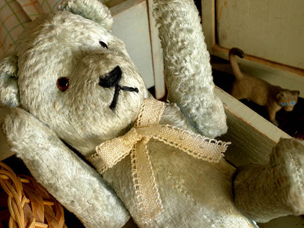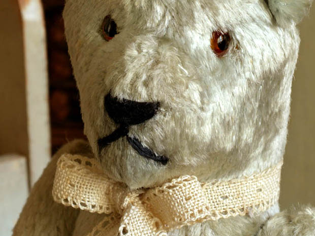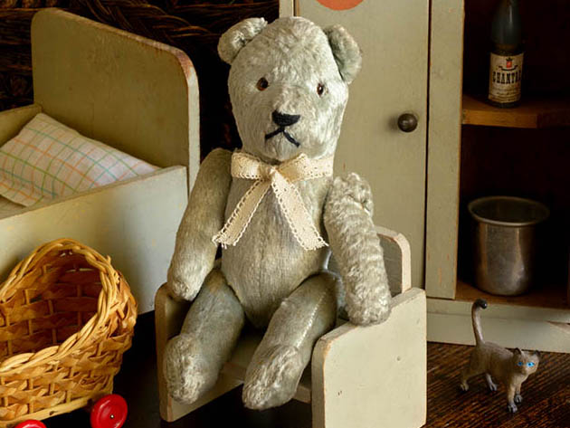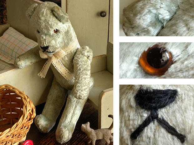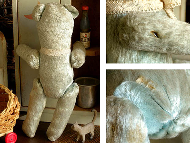 フランスでおそらく1940年代に製造されたぬいぐるみのブルーグリレーヌ・ベべテディウルスです。Teddy Ours(テディウルス/テディベア)は、1902年にアメリカのルーズベルト大統領が熊狩りで傷を負ったウルス(ベア)を逃がしてやったことが評判になったことで、ニューヨークの玩具店がドイツから輸入したウルスのぬいぐるみにルーズベルト大統領の愛称のTeddy(テディ)の名前を付けて売り出したのがテディウルスの始まりのようですが、フランスでは1919年頃からPintel(パンテール)社が、フランスで初めてテディウルスの製造を始めたようです。こちらは超レアなエクリュ(生成り)のリューシュ(フリル)模様のドンテル(レース)のリュバン(リボン)を首に結んだ淡い光沢のあるブルーグリ(ブルーグレー)のレーヌ(ウール)で作られた小さなベべ(ベビー)のテディウルスで、つぶらなノワール(ブラック)と琥珀色のガラス製の目とノワールの糸で刺繍されたお鼻の下のお口でママンウルス(ママベア)を見つめながら優しく微笑んでいるような表情がオシャレで可愛くてとてもいい感じです。また、頭と胴体は固定で胴体と前脚と後脚が針金でジョイントされているので色々な可愛いポーズが楽しめます。また、体の中にはおそらく高級なテディウルスと同じように木毛が詰められているので押すとザクザクした硬い感触があります。また、布タグはありませんが布タグは1950年代の中頃から付けられるようになりこの時代のテディウルスには首に厚紙製のタグが掛けられていたようです。また、ブルーやロゼ(ピンク)のレーヌで作られたテディウルスはフランスでも大変入手が難しくなってきているようです。フランスから遥々やって来たブルーグリの可愛いテディウルスが傍にいるだけで気持ちが優しく癒されてしまいそうな超レアな大変素晴らしい一品です。