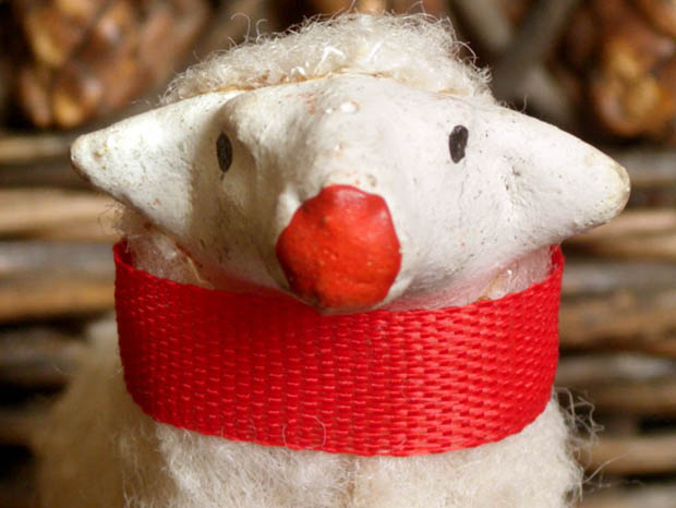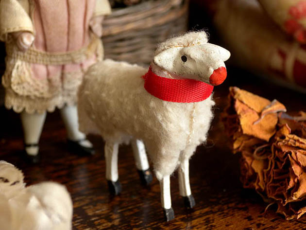 ドイツのドレスデンから南西へ50kmほど行ったチェコとの国境に近いErzgebirge(エルツゲビルゲ/エルツ山地)のSeiffen(ザイフェン)の町で、おそらく1920年代頃に製作された木とコンポジション(おがくずや粘土などをニカワなどで混ぜ合わせて型抜きしたもの)と羊毛で作られたエルツゲビルゲ・ラムフィグーアです。エルツゲビルゲのザイフェンの町では14世紀頃から豊富にある木材から木工品の製作が始まったようで「くるみ割り人形」などが有名なようです。こちらは超レアな小さなサイズのコンポジションの頭と木製の胴体に脚が付いたLamm(ラム/子羊)のフィグーア(フィギュア)で、体には本物の羊毛が貼り付けられています。また、ロート(レッド)のシュライフェ(リボン)を首に巻いて丸いロート(レッド)のお鼻につぶらな黒い瞳でじっとムッティ(ママ)を見ている姿が可愛くてとてもいい感じです。また、お尻のシッポも可愛いですね。おそらく最初はヴァイナハテン(クリスマス)の飾り物に作られたようですが、木製の羊小屋などもあるようなのでいっしょにジオラマで飾ると世界観があって楽しいですね。また、ビスキュイプーペ(ビスクドール)やクロモなどといっしょに飾ってもオシャレですね。優しいローザのお鼻とロートのシュライフェが可愛い本物のように作られた大変可愛いエルツゲビルゲ・ラムフィグーアです。