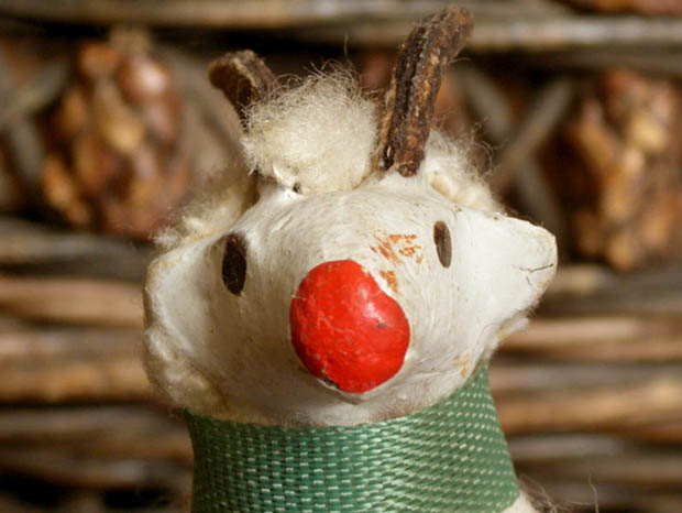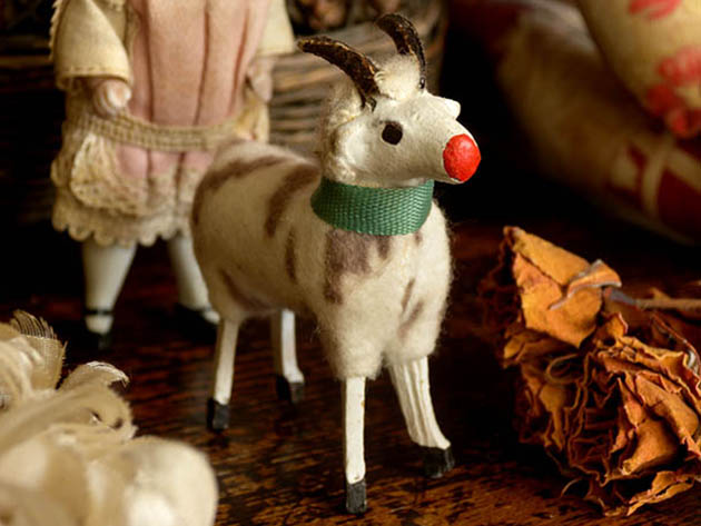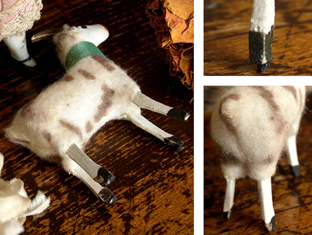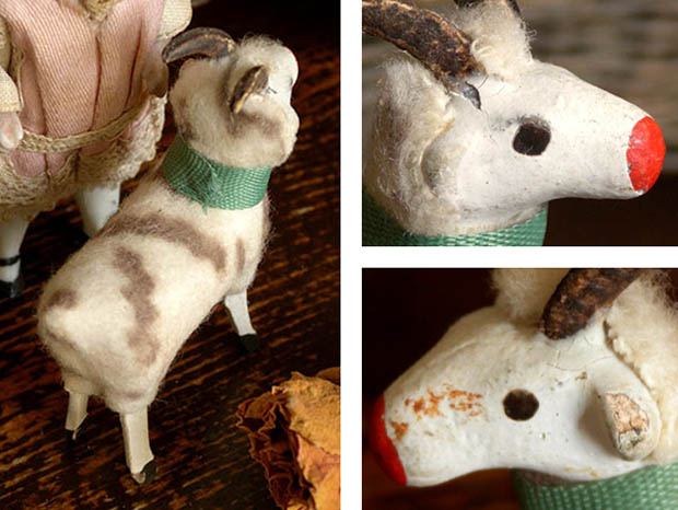ドイツのドレスデンから南西へ50kmほど行ったチェコとの国境に近いErzgebirge(エルツゲビルゲ/エルツ山地)のSeiffen(ザイフェン)の町で、おそらく1920年代頃に製作された木とコンポジション(おがくずや粘土などをニカワなどで混ぜ合わせて型抜きしたもの)と羊毛で作られたエルツゲビルゲ・ゲムゼフィグーアです。エルツゲビルゲのザイフェンの町では14世紀頃から豊富にある木材から木工品の製作が始まったようで「くるみ割り人形」などが有名なようです。こちらは超激レアな小さなサイズのコンポジションの頭と木製の胴体に脚が付いたGamse(ゲムゼ/シャモア、カモシカ)のフィグーア(フィギュア)で、体にはブラウンの斑点がある本物の羊毛が貼り付けられています。また、モースグリューン(モスグリーン)のシュライフェ(リボン)を首に巻いて丸いロート(レッド)のお鼻につぶらな黒い瞳でじっと遠くの山並みを見ている姿が可愛くてとてもいい感じです。また、頭の上の立派な二本の角も可愛いですね。また、ゲムゼはヨーロッパの山地の草原や森林などに多く生息しているようです。また、おそらく最初はヴァイナハテン(クリスマス)の飾り物に作られたようですが、ビスキュイプーペ(ビスクドール)やクロモなどといっしょに飾ってもオシャレですね。本物のように作られた大変可愛いエルツゲビルゲ・ゲムゼフィグーアです。
