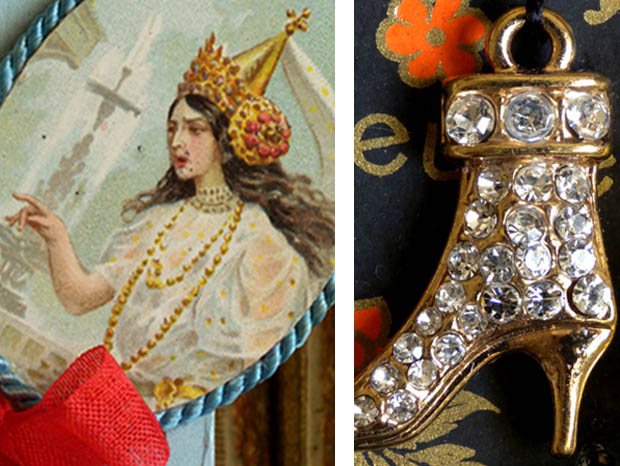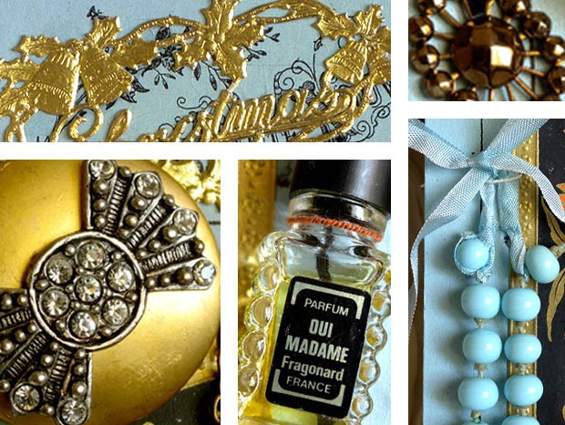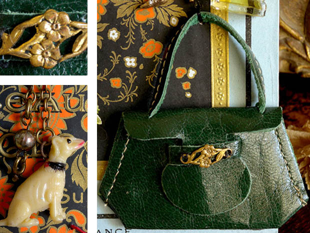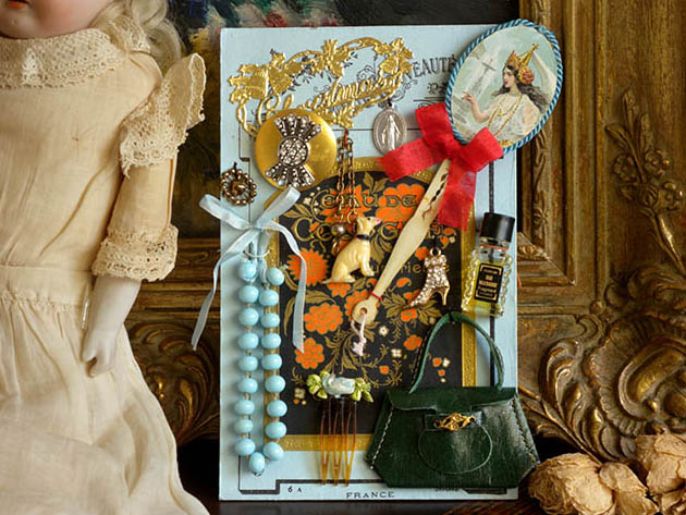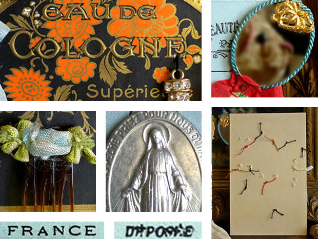 フランスで1910年代から1950年代頃のジュモーやシモン&ハルビッヒなどのビスキュイプーペ(ビスクドール)用の小物を使っておそらく1950年代に作られたほとんどデッドストックのマドモアゼルマンミロワー・プーペアクセスソワー12アンサンブルです。こちらは超レアなブルーパール(ペールブルー)の台紙に細いカウチュ(ゴム)紐と紐で留められたPoupee Accessoires(プーペアクセスソワー/ドールアクセサリー)の12個のアンサンブル(セット)で、台紙の左上からChristmas(クリスマス)の文字とクロッシュ(ベル)とヒイラギの実と葉がデザインされたおそらくセルロイドに金メッキされたオシャレなDecoration(デコラシオン/飾り物)があります。また、その左下には真鍮製の15個のキラキラと光るディアマントシュニット(ダイヤモンドカット)されたお花のようなフォルムのDecoration(デコラシオン/飾り物)があります。また、その横には豪華な15個のキラキラと光るディアマン(ダイヤモンド)のようなガラス製の宝石が付けられた真鍮に金メッキされた大きなBouton(ブトン/ボタン)があり大変凝った作りですです。また、その横には真鍮に金メッキされた鎖のついたセルロイド製のシアン(犬)のDecorationのシャトレーヌの小物がありとても可愛いですね。また、その横にはアルミ製のジェジュ・クリ(イエス・キリスト)のルリエフ(レリーフ)がデザインされたメダイユ(メダル)があります。また、その横にはおそらく復活祭の日に白いローブ(ドレス)を着てカピロテのような金色の円錐形の帽子をかぶったマドモアゼルの姿がデザインされたMain Miroir(マンミロワー/手鏡)がありますが、ミロワー(鏡)の上部には金色のお花のようなルリエフ(レリーフ)のお飾りが付けられているのも素敵です。また、マンミロワーの周りはブルークレール(水色)の紐で縁取りされていますが、ルージュ(レッド)のリュバン(リボン)と淡いロゼ(ピンク)の紐が結ばれたセルロイドの持ち手には金色のアラベスク模様のエンボスがあり大変凝った作りです。また、その右下にはフランスのOui Madame(ウィ・マダム)社のFragonard(フラゴナール)という商品名のParfum(パルファン/香水)が沢山残っているガラス瓶がありとてもエレガントです。また、その横にはキラキラと光るディアマンのようなガラス製の26個の宝石が付けられた美しい真鍮に金メッキされたボット(ブーツ)のDecorationのシャトレーヌの小物があります大変エレガントで素敵です。また、その下にはヴェールフォンセ(ダークグリーン)の本革のSac Main(サークマン/ハンドバック)がありますが、本体のフタの留め具部分には金色のお花のルリエフのお飾りが付けられていてとてもオシャレで可愛いですね。また、その横にはセルロイド製のPeigne(ペーニュ/櫛)の髪飾りがありますが、本体の上部には淡いブルーとヴェール(グリーン)のロココリュバン(リボン)が付けられていてとてもオシャレです。また、その横にはブルーパール(ペールブルー)のリュバンで結ばれた美しいパステルブルーのペルル(ビーズ)が付いたCollier(コリエ/ネックレス)があります。また、オール(ゴールド)の縁取りのあるノワール(ブラック)地にEau de Cologne Superieure(オー・デ・コロン・シュペリウール/高級なオー・デ・コロン)の文字とオランジュ(オレンジ)とオールで沢山のお花がエンボス加工でデザインされたChromo(クロモ)が貼られていてどれもデザインクオリティーが高くてエレガントでオシャレで可愛くてとてもいい感じです。また、台紙の下部にはFrance(フランス)とDeposee(登録商標)の表示があります。こちらはおそらくパリにあるビスキュイプーペ(ビスクドール)を販売しているお店が、ビスキュイプーペの小物を見繕って制作して販売していたもののようですが、フランスのジュモーやなどのビスキュイプーペは大変作りが良くて高額なので、そのビスキュイプーペが持つアクセスソワーも本物のように大変凝った作りのものが多いのですね。お気に入りのビスキュイプーペと飾りたい超レアな大変素晴らしい一品です。