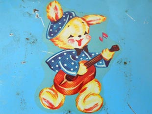 ちらはフタにブルーに白いポルカドットのお揃いのベレー帽とジャケットに黒いボウタイをしたバニー