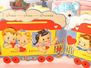 1944年に製作した厚紙製のエクスプレストレインパピー&ドッグハッピーバレンタインカードです。こちら