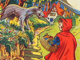 イギリスで1940年代に製造された厚紙製のリトルレッドライディングフード・バースデーカードです。こちらは大変レアなLittle Red Riding Hood(リトルレッドライディングフード/赤ずきんちゃん)の楽しいお話の四つ折りのバースデーカードで、表紙はFond Love-to-day you are(ラブリーな今日の日が大好きよ)の文字と二歳のゴールドの2とダイカットされたブルーとゴールドの舞台の緞帳(どんちょう)のような幕の中には"Good morning" said Little Red Riding Hood.(おはよう、と赤ずきんちゃんが言いました)の文字と森の家に住んでいる病気のおばあさんにバスケットに入ったケーキとブドウ酒を届けに行く途中の道で親切そうな悪いオオカミに出会ったリトルレッドライディングフードのイラストがデザインされていてオシャレで可愛くてとてもいい感じです。また、ゴールドの2の中にもリトルレッドライディングフードと悪いオオカミの姿がエンボスされていてとても凝った作りです。また、中ページにはLot of love on your Birthday(あなたの誕生日にたくさんの愛を)のタイトルと悪いオオカミとおばあさんに変装したオオカミとオオカミに追いかけられているおばあさんのイラスト、”Oh, what a nice big Wolf !"said Granny.(オオ、素敵な大きなオオカミ)の文字とベッドで寝ているおばあさんの家に入ってきた悪いオオカミのイラストがデザインされています。また、裏表紙にはNow Little Red Riding Hood went into the forest to take her old Granny some nice things to eat・・・(今、赤ずきんちゃんは彼女のおばあさんのための美味しそうな食べ物を持って森に入りました・・・)と始まるリトルレッドライディングフードのお話が書かれていてとても凝った作りのバースデーカードです。また、British Manufacture(イギリス製品)の表示もあります。リトルレッドライディングフードはフランス人のシャルル・ペローが1697年に出版した「ペロー童話集」の中にありますが、1812年頃にドイツ人のグリム兄弟が可愛い童話としてリメイクして有名になったようです。当時のイギリスの二歳のチャイルドは今はもう70代の老人になっていますが、こんなに可愛いリトルレッドライディングフードのバースデーカードをもらっていたことが羨ましくなってしまいますね。当時のイギリスの二歳のチャイルドに送られた可愛いリトルレッドライディングフード・バースデーカードです。