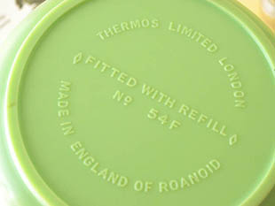 イギリスにあるロアノイド社がおそらく1940年代に製造したプラスチック製のミントグリーンサーモスです。