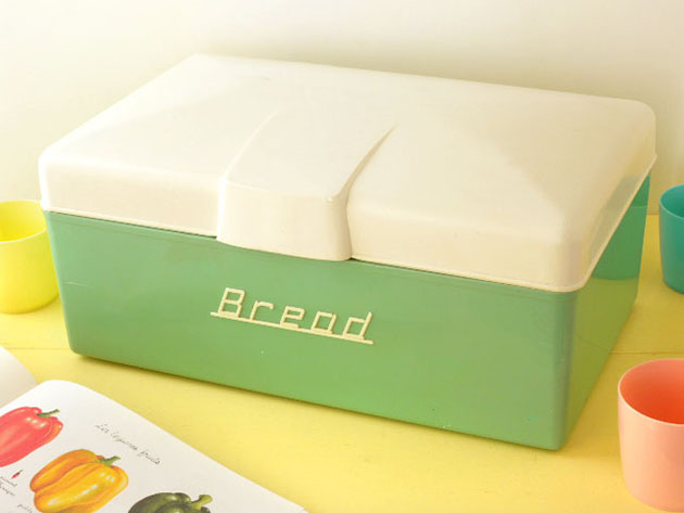イボリーホワイトのフタが付いたパステルグリーンのブレッドボックスで、フタはしっかりとした強度を