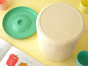 オーストラリアで1923年に創設されたNally(ナリー)社がおそらく1960年代に製造したハードプラスチック製のナリーパステルクリーム&グリーンフラワーキャニスターです。こちらは超レアなパステルグリーンの丸い取っ手のあるフタの付いたパステルクリームのFlour(フラワー/小麦粉)を入れるために作られたキッチンキャニスターで、本体にはFlourと書かれたパステルグリーンの立体のスパゲティロゴが貼り付けられていてオシャレで可愛くてとてもいい感じです。また、フタの周りはシンプルなラインだけのデザインではなくて三つ葉とアールヌーヴォーのアラベスク模様のようなエンボスでデザインされているのも素敵ですね。また、本体の底面にはNally Genuine Ware(本物のナリー製品)のエンボスがあるのもいいですね。また、ナリー社に限らずオーストラリア製の立体の貼付けロゴは長年の使用から折れたり欠けたりした製品が多いですが、こちらは全く折れや欠けがなくとてもきれいです。また、こちらは厚みのあるハードプラスチック製でとてもしっかりとした作りなのがいいですね。とても大きなフラワーキャニスターですが、オーストラリア人は家庭でケーキやクッキーやビスケットやマフィンやパンなどを沢山作るのでこちらのような大きなサイズのフラワーキャニスターが必要なのでしょうね。オーストラリアやアメリカでもナリー社のキッチンキャニスターは以前よりもどんどん人気が高くなってきているようなので入手がとても難しく高価な製品になってきているようですが、デザインがオシャレで可愛いので仕方ないのかも知れません。当時のオーストラリアやアメリカのママ達に愛されたオシャレで可愛いナリーパステルクリーム&グリーンフラワーキャニスターです。