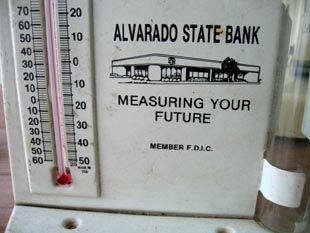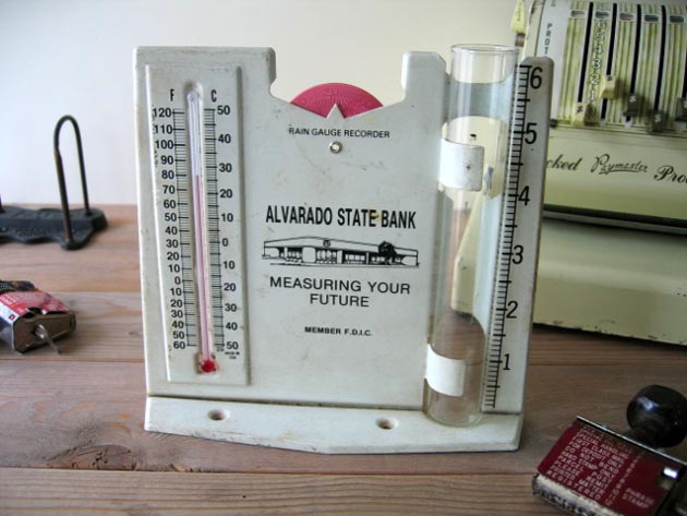 テキサス州のアルバラードにあるアルバラード国立銀行が販促用に作った雨量計です。60ミリまでの
