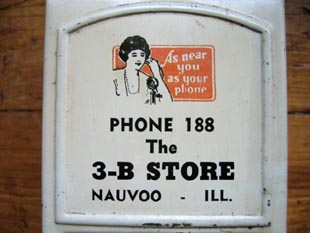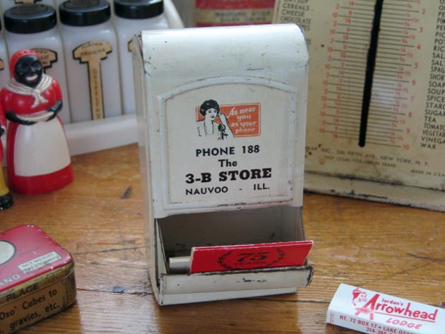 ボックスです。本体には電話をかける女性のイラストと「あなたの電話と同じくらいあなたの近く に」というキャッチコピーが書いてあります。底面の半円形の部分を押すと本体が開きマッチを入れ れます。またワンタッチで閉まる優れものです。ミズーリ州とアイオワ州の州境にあるナヴーの町の