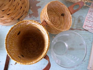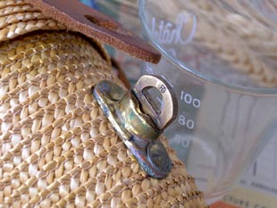 グラスと真鍮の留め金と革のバンドが付いた草編みされた携帯バッグのセットです。飲泉とは医療用に