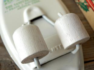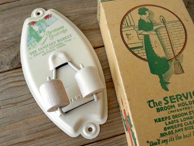 部分は木製でほうきの柄を押し込むと回転して挟みます。ブルームホルダーを製造したのはアイオワ州