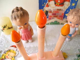 チック製のクリスマス用のピンクのキャンドルライトです。こちらは3本のキャンドルが立ったライト