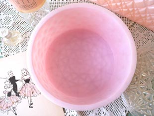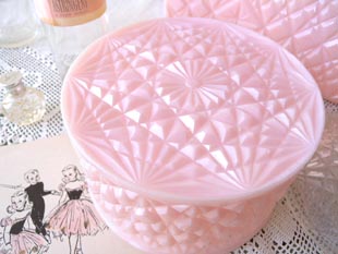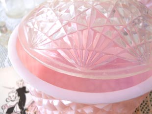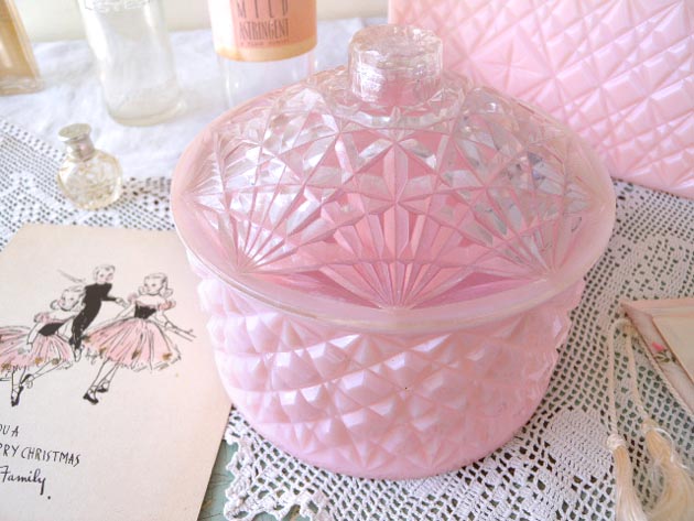 おそらく1950年代に製造されたプラスチック製の透明のフタの付いたピンクのコットンボックスです。