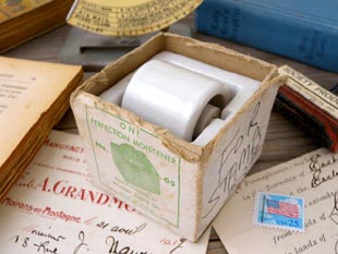 す。スタンプモイスチャーはスタンプ(切手)を濡らすための道具で本体に水を入れローラーを回すと