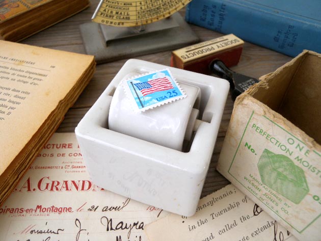 ローラーが濡れ、その上に切手を乗せて濡らすという仕組みになっています。アメリカのオフィスなど