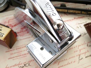 があり、座金の上下が凹凸版になっていて紙を挟んでプレスすると紙面にエンボス加工された版がきれ
