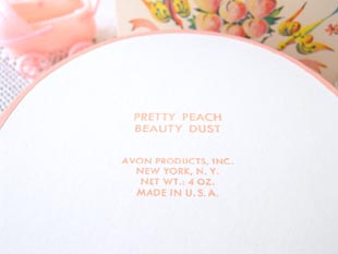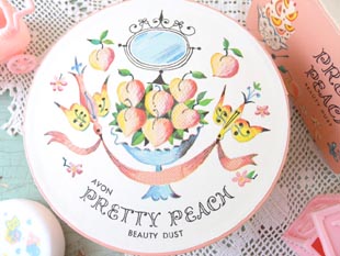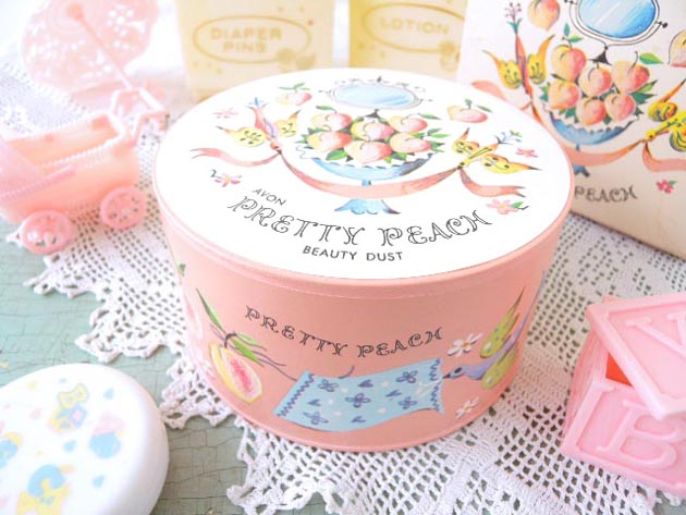 エイボン社がおそらく1960年代に製造した「プリティーピーチビューティーダスト」という商品名の箱