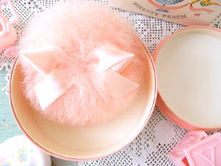 付きのカードボード製のピンクのパウダーボックスです。エイボン社は、図書の訪問販売をしていたデ