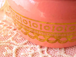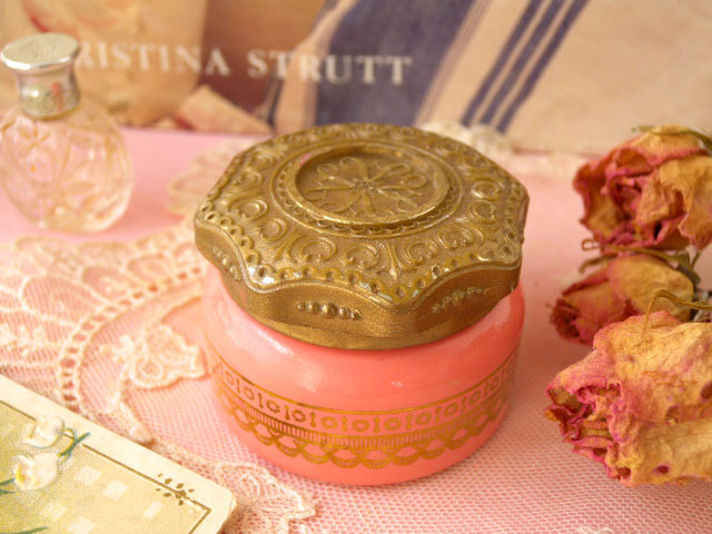 たクリームサシェが入っていたミルクガラス製のゴールド&ピンクアンフォゲッタブルクリームサシェ ボ