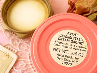 シャレなエイボン社のゴールド&ピンクアンフォゲッタブルクリームサシェボトルです。