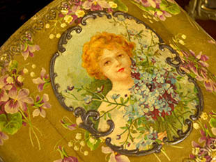 リトルガールのセルロイドプレートに欠けやヒビはなく発色が良くとてもきれいです。お花の化粧紙に多少の傷みや破れがありますが発色が良くきれいです。留め金とビンジに壊れはなくフタはスムーズに開閉します。ピンクのファブリックに剥がれや破れはなくきれいです。その他、多少の傷みや汚れなどがありますが木部のヒビ割れや欠けはなく古いものにしてはとても状態が良くきれいで、Good Conditionです。