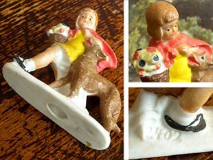 ドイツでおそらく1930年代に製作されてアメリカで販売されていたビスク(白磁)製のリトルレッドライディングフード&ウルフ・ビスクフィギュアです。こちらは大変レアなドイツで製作されたLittle Red Riding Hood(リトルレッドライディングフード/赤ずきんちゃん)の楽しいお話のシーンがデザインされたフィギュアで、森の家に住んでいる病気のおばあさんにバスケットに入った焼き菓子と葡萄酒を届けに行く途中の道で親切そうな悪いウルフ(オオカミ)に出会ったレッドライディングフードがデザインされていてオシャレで可愛くてとてもいい感じです。また、とても動きのあるシーンでデザインされているのも素敵です。本体はおそらくビスクドールと同じように釉薬を掛けないで素焼きされた白磁に後から彩色されているようですが、彩色の発色が良くとても可愛いですね。また、背面には2402の製造番号のエンボスがあります。リトルレッドライディングフードはフランス人のCharles Perrault(シャルル・ペロー)が1697年に出版した「ペロー童話集」の中にありますが、1812年頃にドイツ人のグリム兄弟がチャイルド達のために可愛くリメイクして有名になったようです。小さなフィギュアですがとても世界観ののある可愛い一品です。