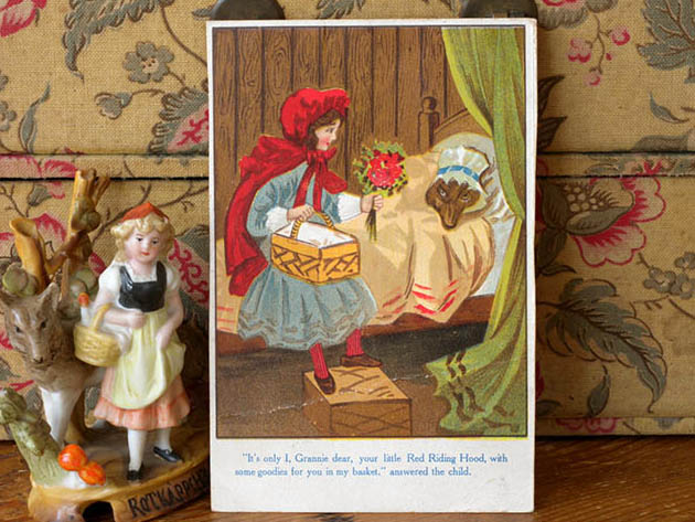 アメリカにあるでC. A. Beaty(ビーティ)社が、おそらく1900年代に製造した厚紙製のレッドライディングフード&ウルフ・ポストカードです。こちらは超レアなRed Riding Hood(レッドライディングフード/赤ずきんちゃん)のお話の楽しいシーンのイラストがデザインされたポストカードで、本体の表面には悪いウルフ(オオカミ)が病気のおばあさんに変装しているとは知らないでバスケットに入った焼き菓子と葡萄酒と途中の森の道で摘んできたきれいなお花を森の家に住んでいる病気のおばあさんに届けに来たレッドライディングフードのイラストがデザインされていてオシャレで可愛くてとてもいい感じです。また、ほのぼのとしたイラストの雰囲気がとても素敵ですね。また、下部には"It's only I, Grannie dear, your Little Red Riding Hood, with some goodies for you in my basket." answered the child.(「私だけの大切なおばあさん、あなたの赤ずきんちゃんですよ、あなたのためにバスケットに焼き菓子が入っていますよ」と子供は答えました)のお話が描かれています。また、イラストは全て特色インクを使った高価な石版印刷で刷られているのでイラストの発色が良く大変きれいです。また、裏面にはPost Cardの表示があります。また、Place stamp here domestic one cent foreigen two cents(ここにスタンプを押します。 国内1センで 海外2セント)の表示もあります。また、消印にはFranklin Pa. Oct 6, 09(ペンシルベニア州フランクリン、1909年10月6日)の表示があります。また、宛名にMiss Harriet Mausonと書かれているのでハリエット・モーソンちゃんに投函されたポストカードのようです。レッドライディングフードのお話は、フランス人のCharles Perrault(シャルル・ペロー)が1697年に出版した「ペロー童話集」の中にありますが、1812年頃にグリム兄弟がチャイルド達のために可愛くリメイクして有名になったようです。ポストカードを見ているだけでリトルレッドライディングフードの可愛い世界に引きずり込まれてしまいそうな超レアな一品です。