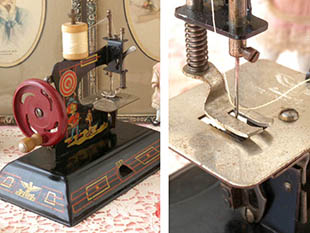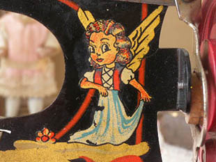 デュッセルドルフから北東へ30kmほど行ったGevelsberg(ゲーヴェルスベルグ)の町で1902年にCarl Sieper(カール・ズィッパー)が創設したCasige(カーズィグ)社が、おそらく1940年代の終わり頃に製造したメタル製のフェー&ヴィルヘルム・テル・シュヴァルツニーマシーナです。こちらは超レアなキンダー(子供)用の玩具のシュヴァルツ(ブラック)のNahmaschine(ニーマシーナ/ミシン)で、本体の右側にある木製のグリフ(ハンドル)の付いたプラスチック製のロート(レッド)のはずみ車を手で回すと布を縫うことができます。また、本体の正面にはロートやゴルト(ゴールド)などでおそらくグリムかアンデルセンの童話にでてくるようなメートヒェン(少女)のFee(フェー/妖精)がデザインされています。また、背面にはおそらく14世紀の初頭にスイスのウーリ州のアルトドルフの町に住んでいたクロスボウ(弓矢)の名手の伝説の英雄のWilhelm Tell(ヴィルヘルム・テル/ウィリアム・テル)と子犬がデザインされていてどちらもオシャレで可愛くてとてもいい感じです。また、本体の台座部分にはロートとゴルトのリーニエ(ライン)で幾何学模様がデザインされていますが、左右の側面にはゴルトでカーズィグ社の鷲のマークとCasigeのロゴと背面には121の番号もデザインされています。また、針板にはエンボスで鷲のマークとMade in Germanyの表示があります。はずみ車のグリフを右回転で回すと布を後ろに送りながら縫い針部分が上下に作動しますが、細部の作りも素晴らしくさすがはドイツ製といえるニーマシーナです。また、デザインや作りが素晴らしいだけではなくて、こちらのトイミシンは下糸を使わないで実際に縫うことができます。縫い方はジーンズの裾などのように下糸を使わない一本の糸で縫う鎖状に輪を続けた(チェーンステッチ)の縫い目で、表側はニーマシーナの針目のように見える本返し縫いで、裏側は鎖状に輪を続けた縫い目で縫われます。また、プラスチック製のはずみ車の背面の縫い針を上下させる丸い部品が壊れたようですが、おそらくドイツの玩具職人が木製のグリフと同じ丸い木製の部品で見事に修理されていますが、修理にマイナスネジが使われているので修理されたのはおそらく1960年代以前のようです。当時のドイツやヨーロッパのキンダー達が憧れた フェーとヴィルヘルム・テルのメルヘンチックなデザインが素晴らしいカーズィグ社の大変価値ある一品です。