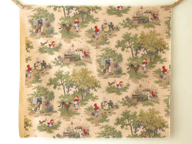 フランスにあるMarignan(マリニョン)社が、おそらく1960年代に製造した木綿製のル・プティシャペロンルージュ&ルー・ティッシュです。こちらは大変レアなグリム童話のLe Petit Chaperon Rouge(ル・プティシャペロンルージュ/赤ずきんちゃん)の可愛いイラストがデザインされたベージュ地の小さなティッシュ(生地)で、本体にはママンからガレット(焼き菓子)とポ(ポット)に入ったブール(バター)を森の家に住んでいる病気のおばあさんに届けるお使いを頼まれているプティシャペロンルージュ、おばあさんの家に行く森の道で親切そうな悪いルー(オオカミ)に出会ったプティシャペロンルージュ、悪いルーにだまされておばあさんのためにきれいなお花を摘んでいるプティシャペロンルージュ、急いで先回りしておばあさんの家の扉を叩いている悪いルー、リ(ベッド)の中のおばあさんの変わりように驚いているプティシャペロンルージュなどのイラストが印刷されていてオシャレで可愛くてとてもいい感じです。また、ティッシュの端にはMarignan(マリニョン) Grand Teint "Meuble"(素晴らしい家具)の表示はありません。プティシャペロンルージュのお話はフランス人のシャルル・ペローが1697年に出版した「ペロー童話集」の中にありますが、1812年頃にグリム兄弟が可愛い童話としてリメイクして有名になったようです。こちらのティッシュは1960年代のフランス製のものですが、1990年代には同じデザインでアメリカ製のものもあります。また、ル・プティシャペロンルージュの小物といっしょに飾るととても可愛いですが、巾着袋などを作ってもオシャレで可愛いですね。見ているだけで楽しくなってきそうな可愛いル・プティシャペロンルージュ&ルー・ティッシュです。