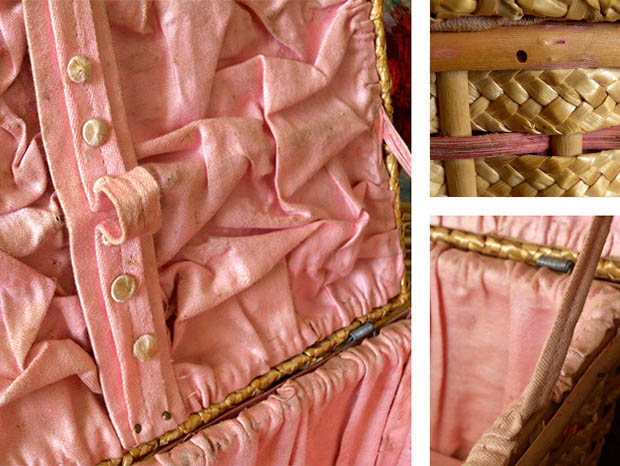 飴色になったロタンの木肌がとてもいい雰囲気です。持ち手とヒンジと留め具に壊れはなくフタはスムーズに開閉します。ロゼの木綿の生地に多少の擦れや傷みがありますがほつれや破れはなくとてもきれいです。写真のように本体の正面の右上のロタンに35ミリ位の割れが一箇所あります。向かって左の側面の上部に虫食いの穴が一箇所ありますが、穴は虫の幼虫が成虫になって出て行ったという証で中に虫はいないようです。エティケットに破れがあります。その他、多少の傷みや汚れなどありますが壊れはなくとても状態が良くきれいで、Good Conditionです。