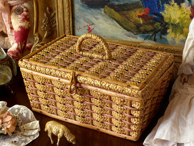 フランスでおそらく1920年代にロタン(ラタン)で製作されたロゼ&ナチュレルロタンオジェ・クチュールパニエです。こちらは超レアなロタンのオジェ(編み込み)で作られたヒンジでフタが開け閉めできるフタの付いたCouture Panier(クチュールパニエ/ソーイングバスケット)で、フタの中央には持ち手が付けられていてフタと本体の正面にはロタンの留め具が付けられています。また、おそらく太いロタンで作られた持ち手とフタの周りの表面は大変細かく編まれたナチュレル(ナチュラル)のロタンで覆われていますが、大変手間のかかった作りです。また、フタと本体はロゼ(ピンク)に塗装されたロタンと大変細かく編まれたナチュレルのロタンで編み込みされていて大変凝った作りでオシャレで可愛くてとてもいい感じです。また、フタを開けるとフタの裏側には木綿のロゼの生地が貼られていますが、中央には縦にシゾー(ハサミ)などを留めるためのサンテュール(ベルト)が付けられているのも便利ですが、サンテュールは六個のイヴォワール(アイボリー)の包みブトン(ボタン)で留められていてとても作りがいいですね。また、本体の内側もロゼの木綿の生地が貼られているのもオシャレです。また、本体の骨組みは無垢材が使われているのでとてもしっかりとした作りですが、本体の底面にはブラン(ブラウン)のおそらく蝋引きされた板紙が貼られています。また、底面にはエティケット(ラベル)が貼られているのでブルジョワ達を顧客に持つパリのボン・マルシェ百貨店やサマリテーヌ百貨店などで販売されていたもののようです。とても使い勝手のいいクチュールパニエですが、クチュールパニエ以外にもオシャレな小物入れとしても色々と楽しく使えそうです。とても機能的に作られているのでとても使いやすそうですが、装飾品のように美しくてオシャレなのでお部屋にあるだけで素敵ですね。ビスキュイプーペ(ビスクドール)などを入れて飾ると大変素敵なロゼ&ナチュレルロタンオジェ・クチュールパニエです。