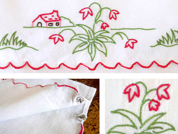 フランスでおそらく1950年代にブランシュ(ホワイト)のリン(リネン)の生地で制作されたル・プティシャペロンルージュ・ブロデルタピスリーです。こちらは大変レアなLe Petit Chaperon Rouge(ル・プティシャペロンルージュ/赤ずきんちゃん)の楽しいお話の場面がブロデル(刺繍)された壁や窓に掛けるために作られたTapisserie(タピスリー/タペストリー)で、本体には森の家に住んでいる病気のおばあさんにガレット(焼き菓子)とブール(バター)が入ったポ(ポット)を届けにいく途中の道の木陰の下で親切そうな悪いルー(オオカミ)に出会ったル・プティシャペロンルージュの姿や家や木や草やミュゲ(スズラン)のお花がルージュ(レッド)やロゼ(ピンク)やジョーヌ(イエロー)やヴェール(グリーン)やブラン(ブラウン)やノワール(ブラック)やブランシュの糸でブロデルされていてオシャレで可愛くてとてもいい感じです。また、本体の上部は飾り布として折り返すようになっていて、こちらにもミュゲのお花や煙突のあるおばあさんの家や木や草がヴェールとルージュとブランの糸でブロデルされていて、折り返し部分には幅が3.8センチ位の棒を通す棒を通せるように二個のブトンプレッシオン(スナップ)で留められていてなかなか凝った作りです。また、本体の裾はリューシュ(フリル)飾りのようにルージュの糸でブロデルされているのも素敵ですね。持ち運びに便利なタピスリーは中世のヨーロッパでは大変人気があり王侯貴族達は屋敷や別荘で豪華なタピスリーを壁に掛けて楽しんでいたようです。また、タピスリーは防寒用としても使われていたようです。窓のリドー(カーテン)として使ったり壁に掛けて飾ったりと工夫次第でオシャレに楽しく使えそうな可愛いル・プティシャペロンルージュ・ブロデルタピスリーです。