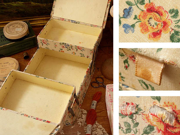 フランスのボン・マルシェ百貨店などでおそらく1910年代に販売されていた板紙にティッシュ(生地)が貼られたローズ&ミオゾティスティッシュ・ブドワールクチュールボワットです。こちらは超レアなおそらく貴婦人が書き物をしたりお化粧や着替えをするための夫でさえ入室できない婦人専用のBoudoir(ブドワール/淑女の私室)で使われていたメタル製のヒンジで三つのボワット(ボックス)が開閉する二段のCouture Boite(クチュールボワット/ソーイングボックス)で、左右の上段にあるヒンジで開け閉めできるフタの付いた二つのボアットを外側に動かすと下段のボワットが開きます。また、上段のボワットには外側に動かすためのロゼ(ピンク)のリュバン(リボン)の持ち手が付けられています。また、本体の表面はベージュ地にロゼ(ピンク)とオランジュ(オレンジ)のローズのお花とブルーのミオゾティス(忘れな草)のお花模様がデザインされていてエレガントでオシャレでとてもいい感じです。また、ボワットの中はイヴォワール(アイボリー)の化粧紙が貼られていますが、フタのティッシュの中にはふかふかの綿が詰められていて大変凝った作りです。また、底面には淡いブラン(ブラウン)の化粧紙が貼られています。また、当時のクチュールボワットは使いやすいだけでなく装飾品のように美しくてオシャレなのでお部屋にあるだけで素敵ですね。当時のパリに住むブルジョワのマドモアゼルやマダム達の気分でオシャレに使いたい大変素晴らしい価値ある一品です。(人形と小物は付属しません)