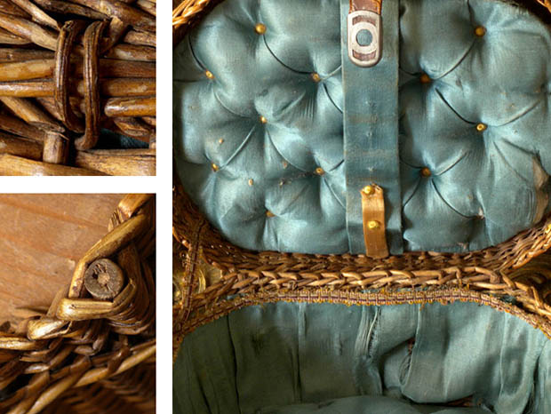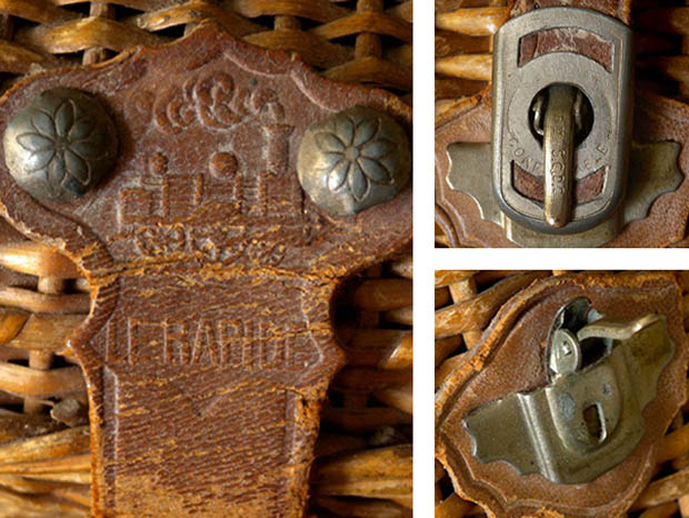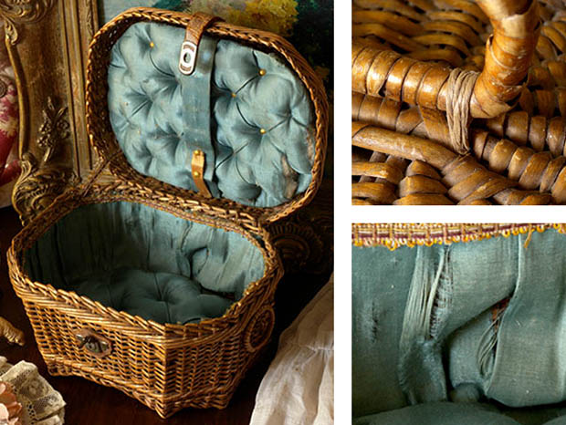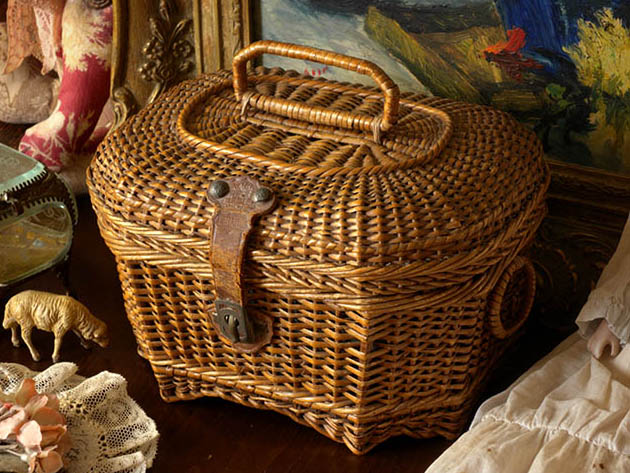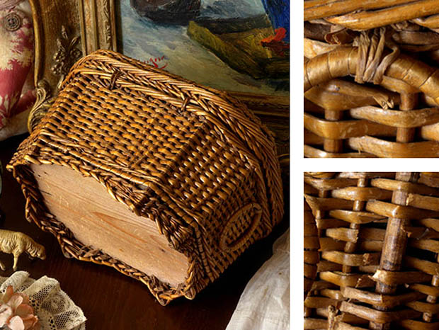 フランスにあるLe Rapide(ル・ラピッド)社が、おそらく1900年代にロタン(ラタン)と板とソワ(シルク)の生地で製作されたブドワール・ロタンオジェ・クチュールコフレです。こちらは超激レアなおそらくBoudoir(ブドワール/淑女の私室)で使われていたCouture Coffret(クチュールコフレ/裁縫箱)のようですが、ブドワールは貴族の婦人が書き物をしたりお化粧や着替えをするための部屋で、夫でさえ入室できない婦人専用のお部屋のことのようです。ロタンのオジェ(編み込み)で作られた楕円形に近い八角形のフォルムのクチュールコフレのフタはロタンのヒンジで開け閉めできます。また、フタの上部の中央にはロタンの持ち手が付けられていてとても素敵です。また、フタと本体の正面には格調高い大変素晴らしい留め具が付けられていますが、フタの留め具はお花模様にエンボスがあるメタル製のリベットで留められた革製で先端にはConfortable(コンフォルターブル/快適な)のエンボスがあるメタル製の金具が取り付けられています。また、本体の留め具は革にメタル製の金具が取り付けられていますが、ルソール(バネ)で上下に動くつく棒をフタの留め具の穴に通して下ろすとフタはしっかりと閉まります。また、フタの革の留め具には煙を吐いて走る機関車のイラストとLe Rapideのロゴのエンボスがありとても素敵です。また、つく棒にはおそらくByc S. C. D. C.のエンボスがあります。また、細いロタンの目の詰まった美しい手の込んだ編み込みも大変素晴らしくてエレガントでオシャレでとてもいい感じです。また、本体の左右の側面にはロタンの輪っかの持ち手がありとてもオシャレです。また、フタを開けるとフタの裏側には光沢のあるブルーヴェール(ブルーグリーン)のソワの生地が貼られていますが、中はふかふかの綿が詰められていて中央には縦にシゾー(ハサミ)などを留めるためのブルーヴェールと光沢のあるベージュのサンテュール(ベルト)が付けられているのも便利です。また、サンテュールなどはクレーム(クリーム)色の包みブトン(ボタン)で留められていてとても作りがいいですね。また、本体の内側もブルーヴェールのソワの生地が貼られているのもオシャレでとても凝った作りです。とても使い勝手のいいクチュールコフレですが、クチュールコフレ以外にもBijoux Coffret(ビジューコフレ/宝石箱)として使ってもとてもいいですね。また、ミニョネットといっしょに飾っても素敵です。当時のフランスのクチュールコフレは使いやすいだけでなく装飾品のように美しくてオシャレなのでお部屋にあるだけで素敵ですね。マリー・アントワネットやポンパドール夫人達が私的な時を過ごしたロココ調のブドワールの雰囲気でエレガントでオシャレに使いたい大変素敵な一品です。