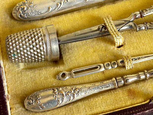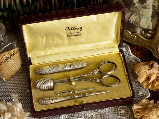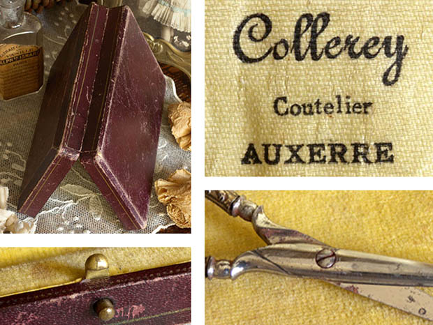 パリから南東へ130kmほど行ったAuxerre(オーセール)の町にあるCollerey(コレリー)社が、おそらく1920年代に製造した木製のボワット(ボックス)に入ったネセセール・ドゥ・クチュール5アンサンブルです。こちらは超レアなブランルージュフェンセ(ダークブラウンレッド)の革のような柄の化粧紙が貼られた木製のボワットに入ったおそらく真鍮にアルジャン(シルバー)メッキされたの5個のNecessaire de Couture(ネセセール・ドゥ・クチュール/ソーイングセット)で、ボワットのフタはヒンジで開閉してフタと本体には真鍮製の留め金が付けられています。また、フタの裏側はクレーム(クリーム)のソワ(シルク)のような光沢のある柔らかな生地が張られています。また、生地にはノワール(ブラック)でCollerey, Coutelier(クトゥリエ/刃物製造業) Auxerreの文字がデザインされていてとても素敵です。また、本体の中は木部の上に淡いベージュのヴルール(ベルベット)のような生地が張られていますが、中に入れるものが上手く収まるようにように窪みが付けられていてとても作りがいいようです。また、Etui Aiguille(エチュイ・エギュイーユ/針ケース)、De(デ/指ぬき)、Ciseaux(シゾー/ハサミ)、Passe-Lacet(パスラセ/紐通し)、Poincon(ポワソン/千枚通し)がアンサンブル(セット)されていますが、手の込んだアールヌーヴォーのアラベスク模様がルリエフ(レリーフ)でデザインされていてエレガントでオシャレでとてもいい感じです。また、シゾーの刃の部分とポワンソンの針の部分は真鍮では作れないので刃金で作られているようです。一世紀以上も前に製造されたものですが、シゾーの刃の切れ味がとてもいいのでまだまだ便利に使えそうですね。フランスでも大変人気の高いネセセール・ドゥ・クチュールは使っても飾っても当時のフランスのブルジョワのマドモアゼルやマダム達のような優雅な気分にさせてくれそうな大変素晴らしい一品です。