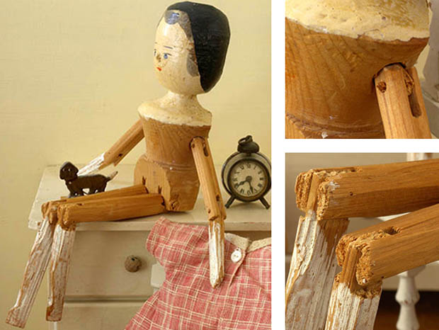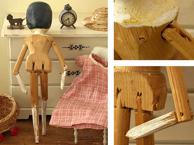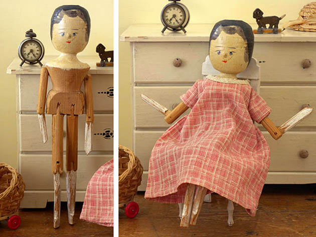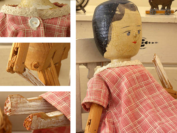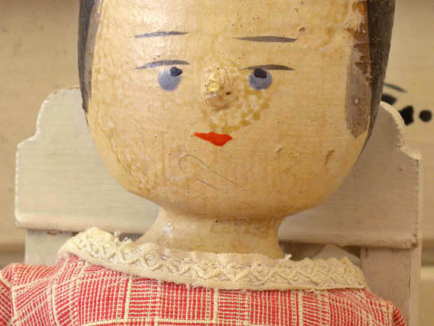 アメリカでおそらく1900年代に製作されたギンガムチェックの木綿のワンピースを着たウッデン(木)製のリトルガール・ウッデンペグドールです。Peg Doll(ペグドール)はイタリアの南チロル地方のヴァル・ガルデーナの町で作られた木製のドールが始まりのようですが、その後ドイツやオランダやアメリカで多く製作されたようです。また、Peg Doll(ペグドール)の名前はClothespeg(クロスペグ/洗濯バサミ)のペグから付けられたようです。また、初期の頃のペグドールは木製の洗濯バサミの側面に穴を空けて腕になる木の棒を差し込んだだけのものでしたが、その後にお顔の彩色がされ腕や脚はジョイントで動かせるようになったようです。また、ペグドールは衣服を着せられていない状態で販売されていたようなのでチャイルド達は布切れから自分でドレスを作ったようです。また、ペグドールはPenny Doll(ペニードール)とも呼ばれていますが、これは1ポンドの100分の1のペニー(1セント)の価格のドールのことのようです。また、ペグドールは当時は高価なビスクドールが買えない庶民のチャイルド達のドールでしたが、今では世界中で人気が高くてとても高価なドールになっているようです。こちらは超レアなピンクとホワイトのチェックのワンピースを着たリトルガールのペグドールで、彩色された黒髪と肌色に彩色されたお顔のつぶらな灰色がかったブルーの瞳と小さな赤い口元で優しく微笑んでいるような表情がオシャレで可愛くてとてもいい感じです。また、ワンピースの襟ぐりに付けられたアイボリーのアラベスク模様のリボン飾りもオシャレですね。また、小さなお鼻は彩色ではなく立体で作られているのも可愛いですね。また、首と胸元も肌色で彩色されていて肘から下の腕と膝から下の脚はホワイトで彩色されていますが、その他は彩色されていなく飴色になった木肌がとてもいいですね。また、足の先端は赤い靴を履いているように彩色されていましたがほとんど剥がれいいます。また、頭は固定されていて胴体と腕と肘と脚と膝が全て木材でジョイントされているのでいろんなポーズが楽しめるのが嬉しいです。ピンクとホワイトのギンガムチェックのワンピースを着た優しそうなつぶらな灰色がかったブルーの瞳のペグドールに見つめられているだけでどんどんとペグドールの世界へ引きずり込まれて行ってしまいそうな超レアな大変価値ある一品です。