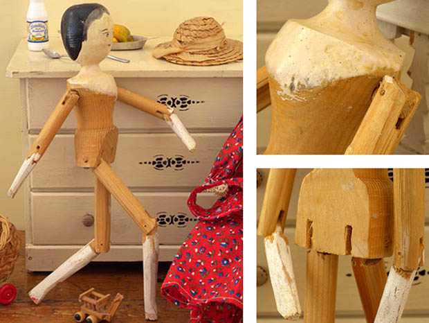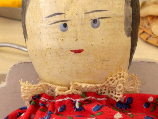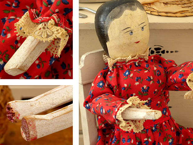 アメリカでおそらく1900年代に製作された木綿のレッドのドレスを着たウッデン(木)製のフラワーレッドドレス・リトルガールウッデンペグドールです。Peg Doll(ペグドール)はイタリアの南チロル地方のヴァル・ガルデーナの町で作られた木製のドールが始まりのようですが、その後ドイツやオランダやアメリカで多く製作されたようです。また、Peg Doll(ペグドール)の名前はClothespeg(クロスペグ/洗濯バサミ)のペグから付けられたようです。また、初期の頃のペグドールは木製の洗濯バサミの側面に穴を空けて腕になる木の棒を差し込んだだけのものでしたが、その後にお顔の彩色がされ腕や脚はジョイントで動かせるようになったようです。また、ペグドールは衣服を着せられていない状態で販売されていたようなのでチャイルド達は布切れから自分でドレスを作ったようです。また、ペグドールはPenny Doll(ペニードール)とも呼ばれていますが、これは1ポンドの100分の1のペニー(1セント)の価格のドールのことのようです。また、ペグドールは当時は高価なビスクドールが買えない庶民のチャイルド達のドールでしたが、今では世界中で人気が高くてとても高価なドールになっているようです。こちらは超レアなレッド地にアイボリーとダークブルーとグリーンの色合いのお花模様のドレスを着たリトルガールのペグドールで、襟ぐりと袖口には生成りのアラベスク模様のレースのフリルが付けらけているのも素敵ですが、ウエストで結んだドレスとお揃いのリボンもオシャレです。また、彩色された黒髪と肌色に彩色されたお顔のつぶらな灰色がかったブルーの瞳と小さな赤い口元で優しく微笑んでいるような表情がオシャレで可愛くてとてもいい感じです。また、首と胸元も肌色で彩色されていて肘から下の腕と膝から下の脚はホワイトで彩色されていますが、その他は彩色されていなく飴色になった木肌がとてもいいですね。また、足の先端は赤い靴を履いているように彩色されていましたがほとんど剥がれいいます。また、頭は固定されていて胴体と腕と肘と脚と膝が全て木材でジョイントされているのでいろんなポーズが楽しめるのが嬉しいです。フラワーレッドドレスを着た優しそうなつぶらな灰色がかったブルーの瞳のペグドールに見つめられているだけでどんどんとペグドールの世界へ引きずり込まれて行ってしまいそうな超レアな大変価値ある一品です。