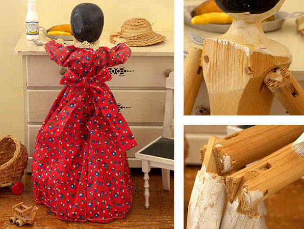 お顔の彩色の剥がれが少なくとてもきれいです。元から立体のお鼻ではありません。全てのジョイントに壊れはありません。虫食いの跡はありません。ドレスはおそらく1910年代から1930年代頃にペグドール用に作られたもののようでほつれや破れはなく大変きれいです。その他、多少の傷みや彩色の剥がれや汚れなどありますが欠けや壊れはなく大変状態が良くきれいで、Good Conditionです。