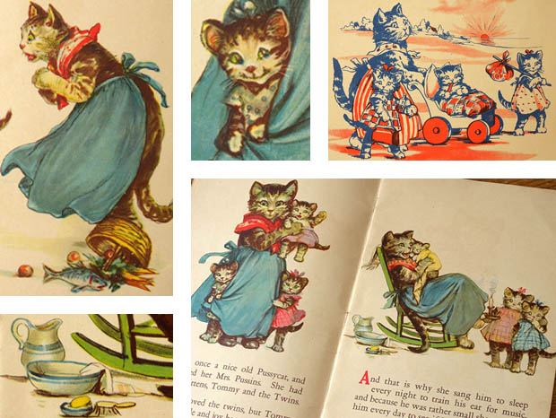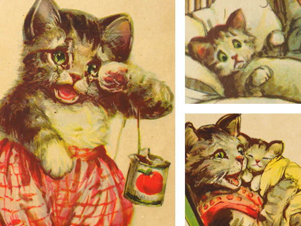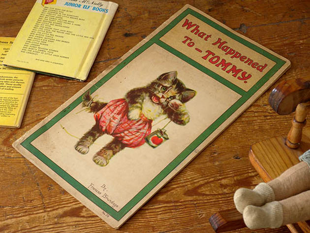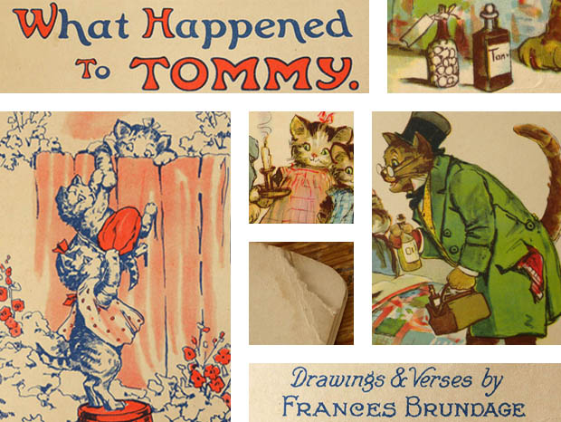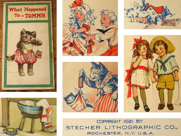 アメリカのニューヨーク州のオンタリオ湖に面したロチェスターの町で1887年に印刷業者のFrank Stecher(フランク・ステッカー)が創設したStecher Lithographic Co.(ステッカー・リトグラフィック社)が、1921年に出版した厚紙製のホワット・ハプンド・トゥー・トミー・ピクチャーブックです。こちらは超レアなWhat Happend To Tommy(ホワット・ハプンド・トゥー・トミー/トミーに何が起こったの)というタイトルのPicture Book(ピクチャーブック/絵本)で、本体は表紙を入れて全部で18ページあり中ページは文章とフルカラーイラストが6点でダークブルーとレッドの二色刷りのイラストが8点あります。また、グリーンの縁取りのあるアイボリー地の表紙の上部にはイエロー地にレッドでWhat Happend To Tommyのタイトルがデザインされています。また、その下にはピンクのロンパースを着た子猫のトミーが紐が付けられたトマトの空き缶をシッポに結ばれて泣いている姿のイラストがデザインされていてとても可愛いです。また、下部にはBy Frances Brundage(フランシス・ブランデージ作) No.29の表示があります。また、中ページの最初には猫のプッサンズ夫人が子猫のトミーをお包みに包んで手持ち秤で体重を量っているイラストがデザインされていますが、その下にはTommy(トミー)とロゴとCopyright 1921 by Stecher Lithographic Co.(ステッカー・リトグラフィック社による1921年の著作権) Rochester, N. Y. U.S.A.(アメリカのニューヨーク州のロチェスター) Drawings & Verses by Frances Brundage(絵と文はフランシス・ブランデージ)の表示もあります。また、こちらのピクチャーブックの絵と文の作者は、ニュージャージー州のニューアークの町で1854年6月28日に生まれた画家のブランデージで、愛らしく魅力的な子供達の絵で有名なようです。また、本文は、There was once a nice old Pussycat, and they called her Mrs. Pussins. She had three little Kittens, Tommy and the Twins. Mrs. Pussins loved the twins, but Tommy was her pride and joy because he looked so much like his dear father, and it was her earnest wish for Tommy to inherit his father's Wonderful Voice(昔々、素敵な年老いた猫がいました。みんなは彼女をプッサンズ夫人と呼んでいました。彼女にはトミーと双子の3匹の子猫がいました。プッサンズ夫人は双子を可愛がっていましたが、トミーは彼女の自慢の子でした。なぜなら、トミーは愛する父親にとてもよく似ていたからです。そして、トミーが父親の素晴らしい声を受け継いでくれることを彼女は心から願っていました)の文章と双子の姉妹の子猫達にドレスを掴まれてトミーを抱き上げて幸せそうにしているプッサンズ夫人のイラストがデザインされたページから始まりますが、お話は、ある日プッサンズ夫人が夕食用の魚を買いに出かけると、三匹の子猫達はフェンスを乗り越えて道路に出てずっと先にある隣の家まで歩いて行くと門の所にジャックとポリーがブランコで遊んでいました。彼らは生まれつき優しい心の持ち主でしたが、時々、遊び方が少し無神経で乱暴でした。彼らは子猫達を見つけるとポリーがトミーを抱き上げましたがジャックがボクにも抱かせろと引き離そうとするとトミーは痛がって泣き出してしまいましたが、この後トミー達はどうなってしまうのでしょうか。105年も前に出版された子猫達のピクチャーブックですが、見ているだけで気持ちが優しく癒されてしまいそうな大変可愛い一品です。