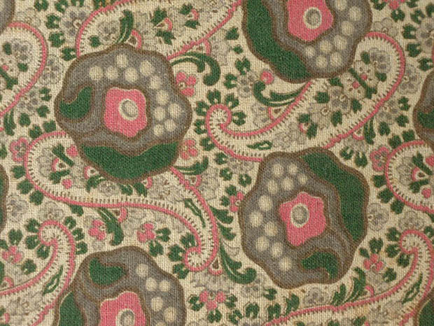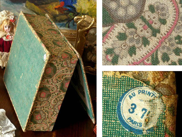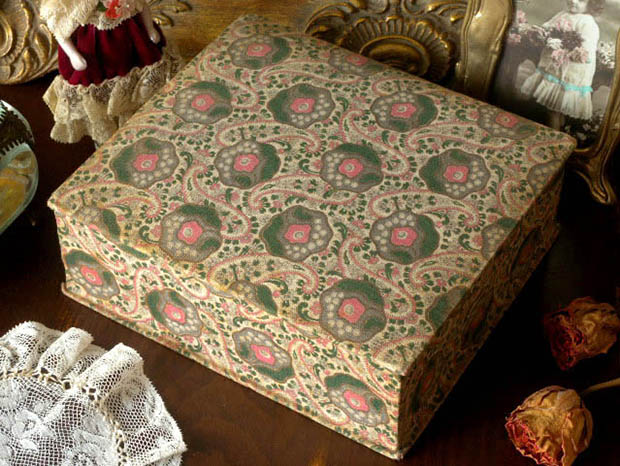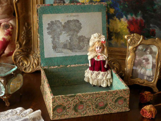 パリ9区のオスマン大通りで1865年にJules Jaluzot(ジュール・ジャリュゾ)が開業したPrintemps(プランタン)百貨店が、おそらく1900年代に販売したカルトン(厚紙)とティッシュ(生地)と木材で製作されたロゼアネモ-ヌペイズリーティッシュ・ビブロウボワットです。パリのサンラザール駅の近くにあるプランタン百貨店はポール・セディーユが設計したヴェール(ガラス)工芸のアールヌーヴォーの丸い屋根のある建物ですが、現在では歴史的な建造物となっているようです。こちらは大変レアなヒンジでフタが開閉するおそらく婦人用のビブロウ(小物)などを入れるために作られたボワット(ボックス)で、フタと本体にはベージュ地にロゼ(ピンク)のアネモ-ヌ(アネモネ)のお花と小さなブランシュ(ホワイト)とロゼのお花のペイズリー模様の木綿のティッシュが貼られていてエレガントでオシャレで可愛くてとてもいい感じです。また、フタを開けるとフタの裏側と本体の中はブルーヴェール(ブルーグリーン)の化粧紙が貼られています。また、フタの中央部分にはen Normandie(ノルマンディーで)の文字とパリから北西へ200kmほど行ったモン・サン・ミッシェルの岩島の修道院で有名なノルマンディー地方の煙突のある家と高い二本の樹木の間にある道を走る荷馬車と人影のある風景画が印刷された紙が貼られていてとても素敵です。こちらの風景画を描いた作者はおそらくフランスでは有名な19世紀の画家のようですが、フランスのビブロウボワットはさすがにオシャレですね。また、底面にもブルーヴェールの化粧紙が貼られていますが、角にはプランタン百貨店のエティケット(ラベル)が貼られていてAu Printemps 3.70 Parisの表示があるので当時は3フラン70サンチームの価格だったようですが、やはり庶民にはちょっとお高い高級品だったようです。大切なビブロウを仕舞うのにもとても便利ですが、小さなクチュールボワット(裁縫箱)として使ってもとても使い勝手が良いようです。フランスのビブロウボワットは使いやすいだけでなく装飾品のように美しくてオシャレなのでお部屋にあるだけで素敵ですね。当時のパリに住むマドモアゼルやマダム達の気分でオシャレに使いたい大変レアな素晴らしいロゼアネモ-ヌペイズリーティッシュ・ビブロウボワットです。(人形は付属しません)