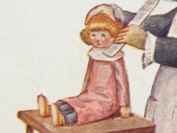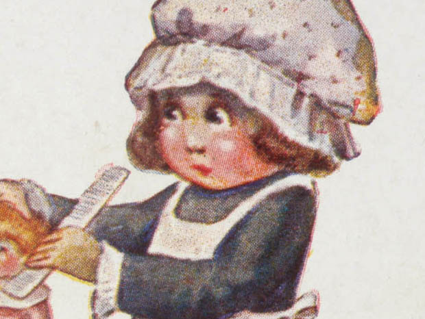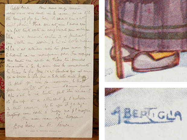 イタリアでおそらく1910年代に製造された厚紙製のラガッツァ・アル・ペッティナトリーチェ・カルトリーナです。こちらは大変レアな画家のAurelio Bertiglia(アウレリオ・ベルティリア)が描いた可愛いラガッツァ(少女)のイラストがデザインされたCartolina(カルトリーナ/ハガキ)です。アウレリオ・ベルティリア(1891-1973)は、可愛い子供達を沢山描いて有名ですが、政治風刺画でさえ軍人や政治家を子供として描いたようです。本体の表面には、人形の髪の毛を櫛でとかしている頭にクーフィア(ボンネット)をかぶってヴェスティート・グレムビューレ(エプロンドレス)を着たラ・ペッティナトリーチェ(美容師)の少女ラガッツァのイラストがデザインされていてオシャレで可愛くてとてもいい感じです。また、イラストにはAurelio Bertigliaの署名があります。また、下部にはイタリア語でLa Pettinatrice(ラ・ペッティナトリーチェ/美容師)、フランス語でLa Coiffeuse(ラ・コワフーズ/美容師)、英語でHairdresser(ヘアドレッサー/美容師)の表示もあるのでパリやロンドンでも販売されていたようです。また、裏面にはMade in ItalyとProprieta artistica riservata(保護された芸術的所有権)などの表示もあります。見ているだけで当時のイタリアの可愛いラガッツァ達に気持ちが優しく癒されてしまいそうな大変素晴らしい一品です。