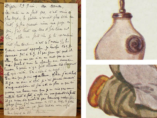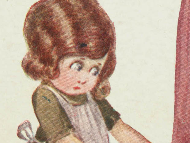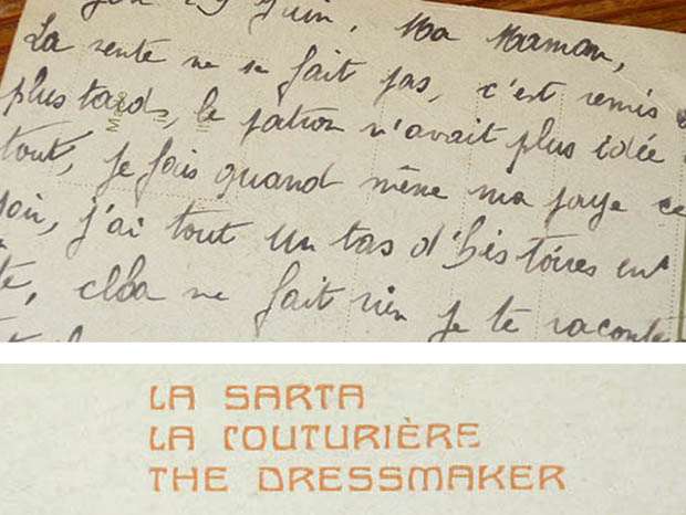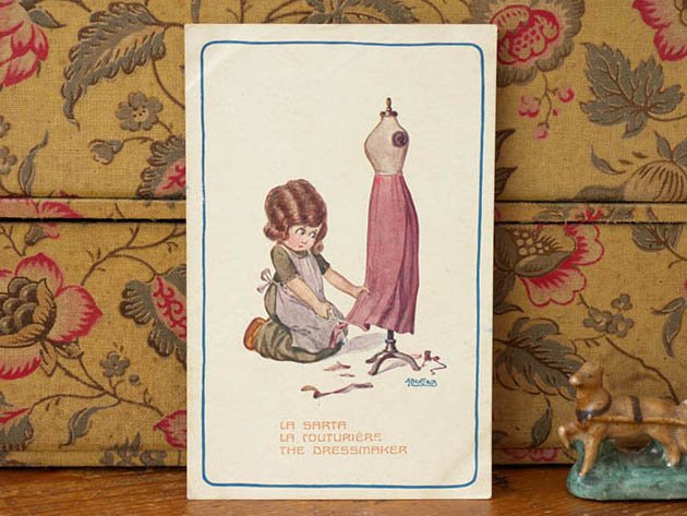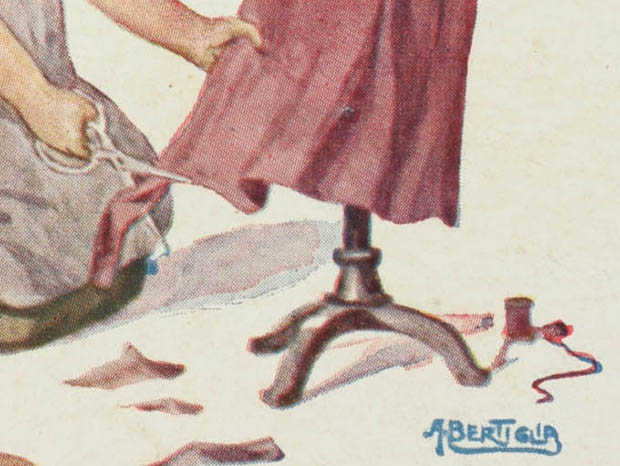 イタリアでおそらく1910年代に製造された厚紙製のラガッツァ・アル・サルタ・カルトリーナです。こちらは大変レアな画家のAurelio Bertiglia(アウレリオ・ベルティリア)が描いた可愛いラガッツァ(少女)のイラストがデザインされたCartolina(カルトリーナ/ハガキ)です。アウレリオ・ベルティリア(1891-1973)は、可愛い子供達を沢山描いて有名ですが、政治風刺画でさえ軍人や政治家を子供として描いたようです。本体の表面には、フォルビチ(ハサミ)で布を切りながらヴェスティート(ドレス)を作っているラ・サルタ(お針子)のラガッツァのイラストがデザインされていてオシャレで可愛くてとてもいい感じです。また、イラストにはAurelio Bertigliaの署名があります。また、下部にはイタリア語でLa Sarta(ラ・サルタ/お針子)、フランス語で La Couturiere(ラ・クーテュリエ/お針子)、英語でThe Dressmaker(ザ・ドレスメーカー/お針子)の表示もあるのでパリやロンドンでも販売されていたようです。また、裏面にはMade in ItalyとProprieta artistica riservata(保護された芸術的所有権)などの表示もあります。見ているだけで当時のイタリアの可愛いラガッツァ達に気持ちが優しく癒されてしまいそうな大変素晴らしい一品です。